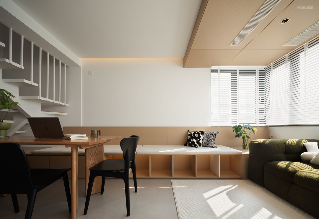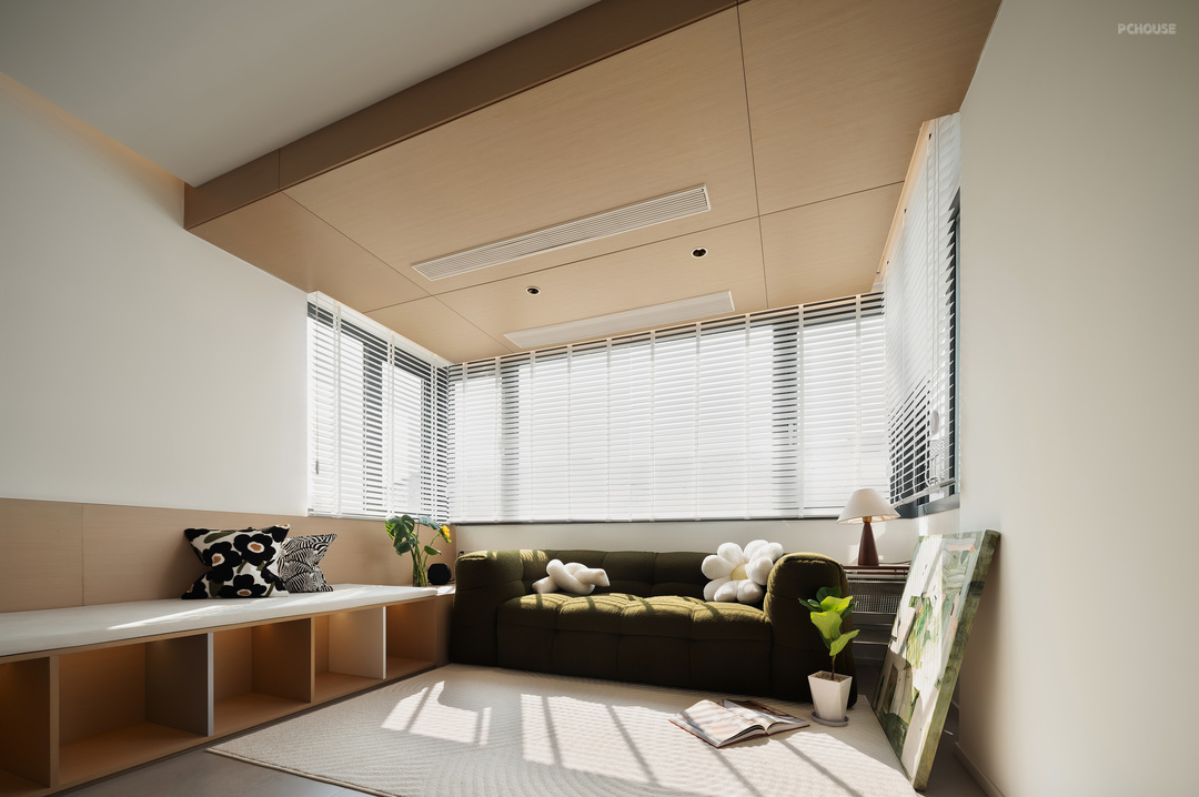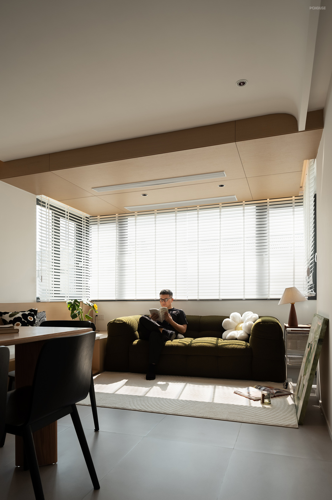 客厅顶面的木饰面与卡座材质相呼应,让整个客厅空间更具包裹感。南侧大面的窗户让客厅空间得到更持久的光照。