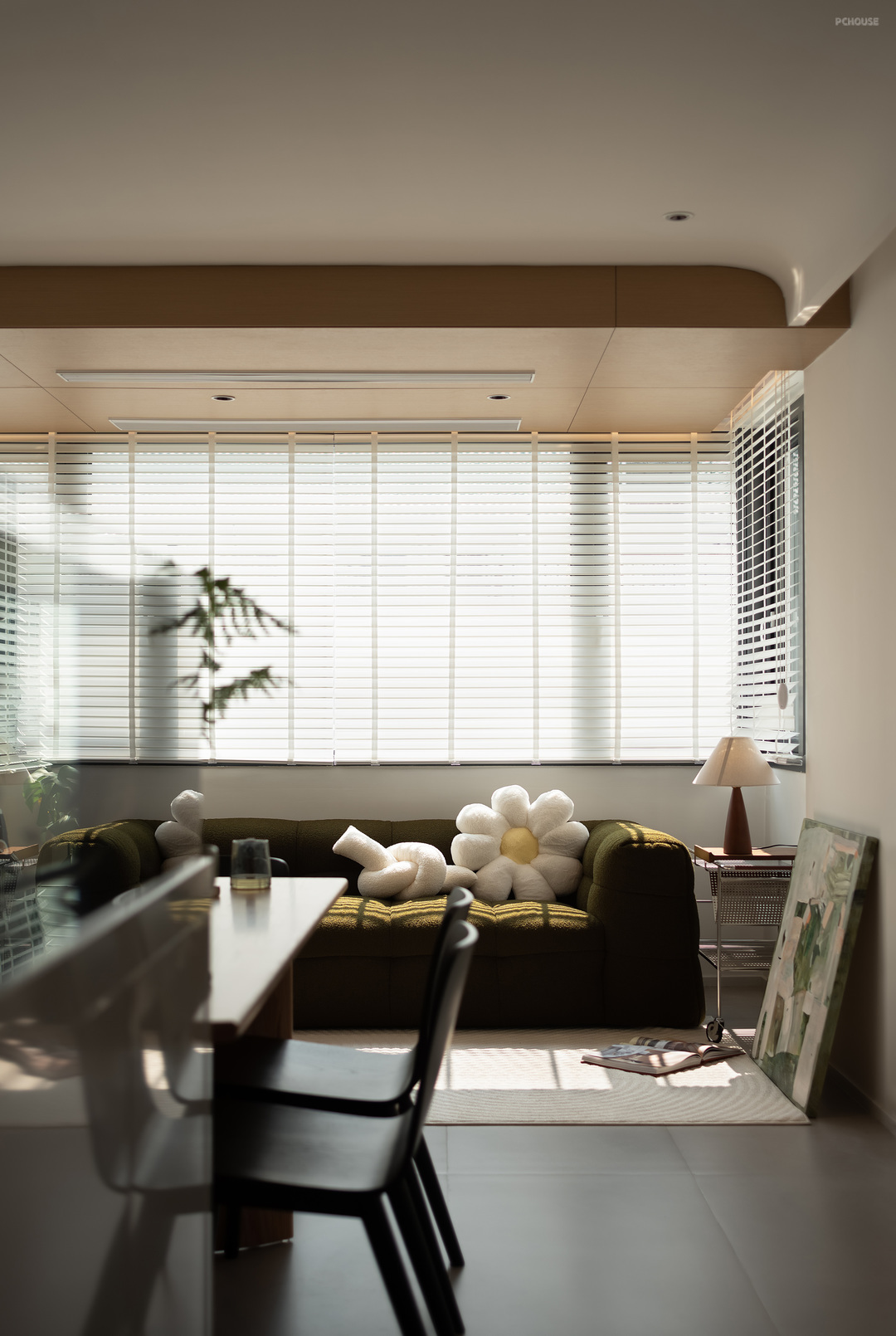餐厅的卡座一直延伸至客厅,卡座下方预留了部分开放格设计,这里可以放置屋主平时爱看的书籍。靠窗处搭配了绿色的毛呢沙发,让屋主拥有一个惬意舒适的休闲区。