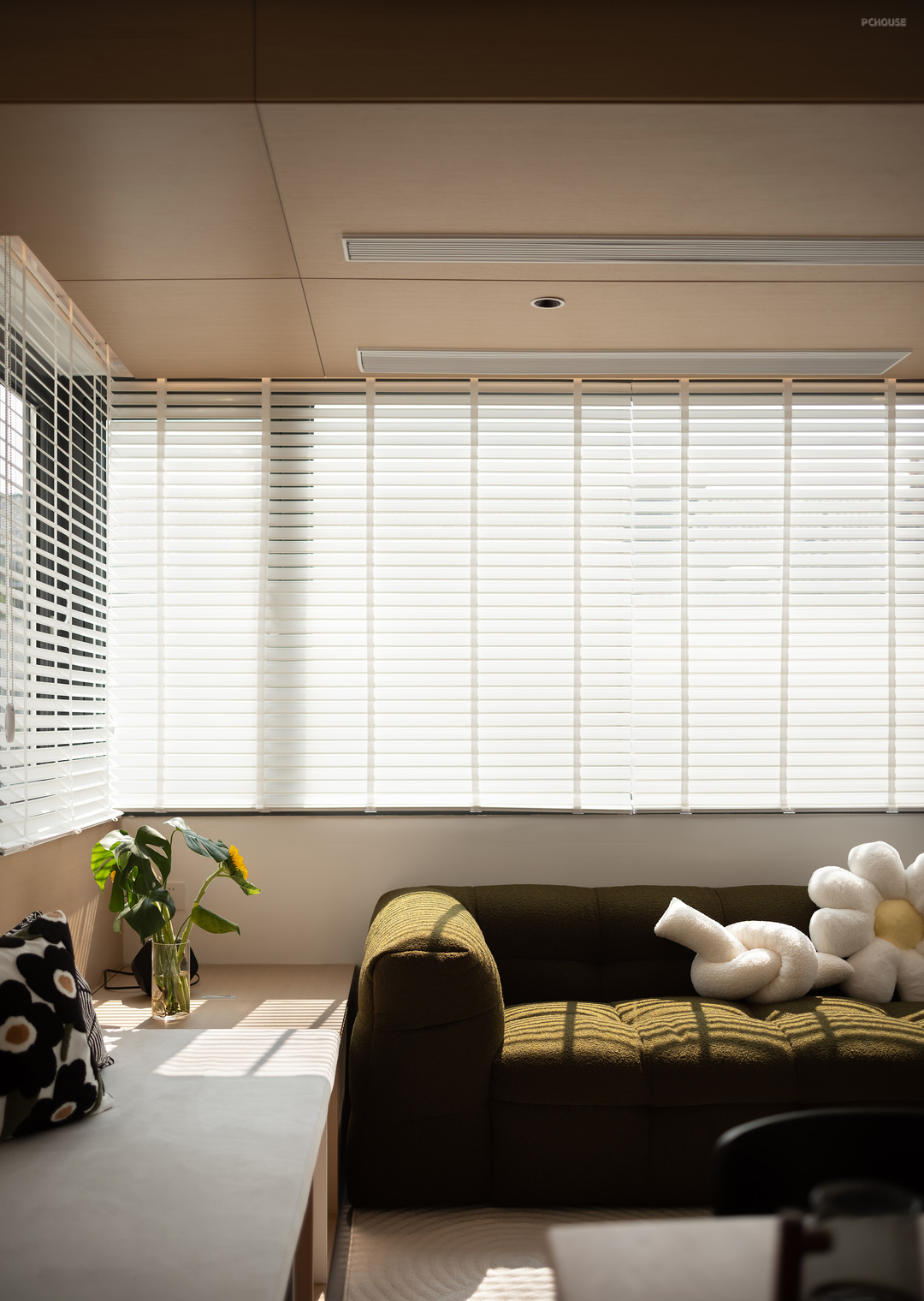 从餐厅看向客厅,阳光透过白色的布百叶帘给室内带来有趣的光影变化。布百叶赋予阳光独特的气质,让屋主感受家的温柔。