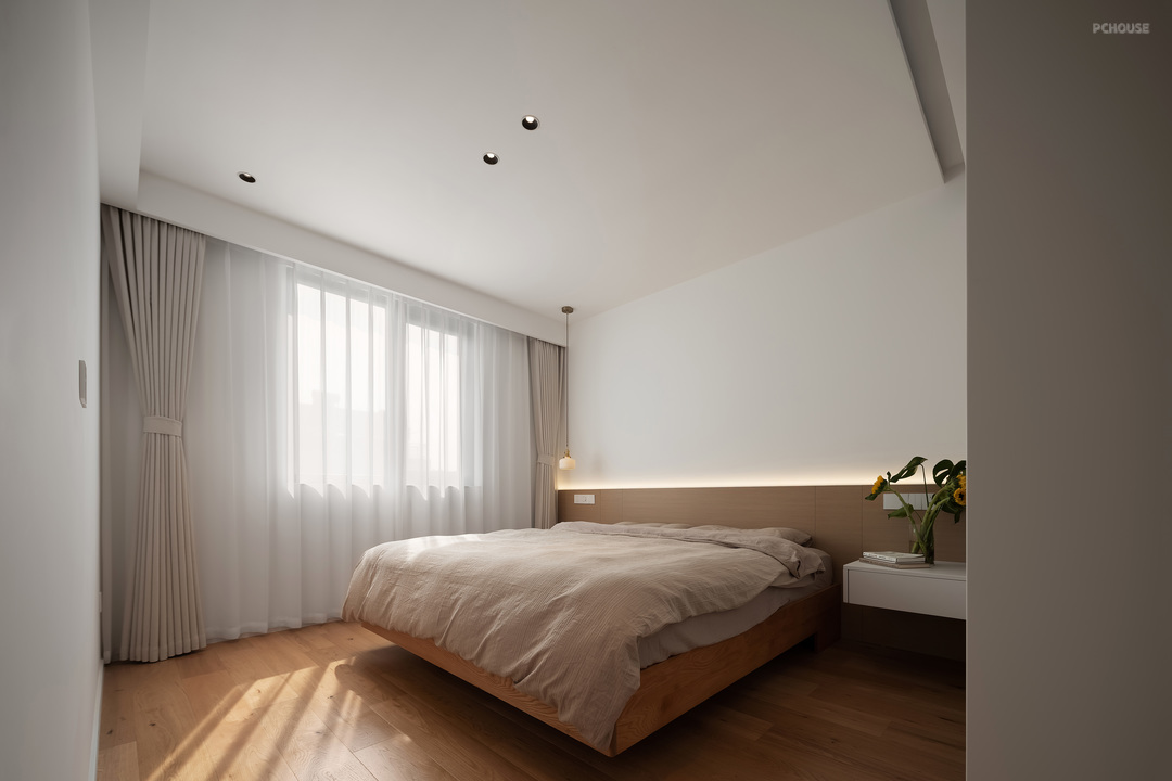 卧室用原木色的半高护墙作为床靠背,护墙上方的暗装灯带提升了空间氛围感。