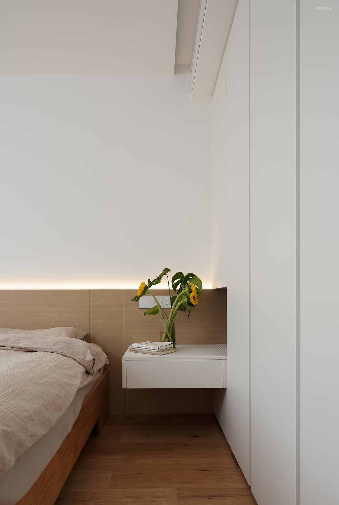 床头采用了白色的悬浮床头柜,轻量化的设计让原本紧凑的空间在视觉上得到放大,床头柜与衣柜相互连接,使得整体空间更加协调。
