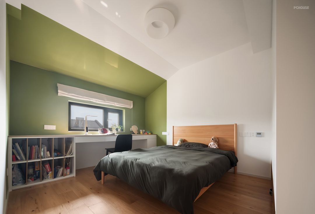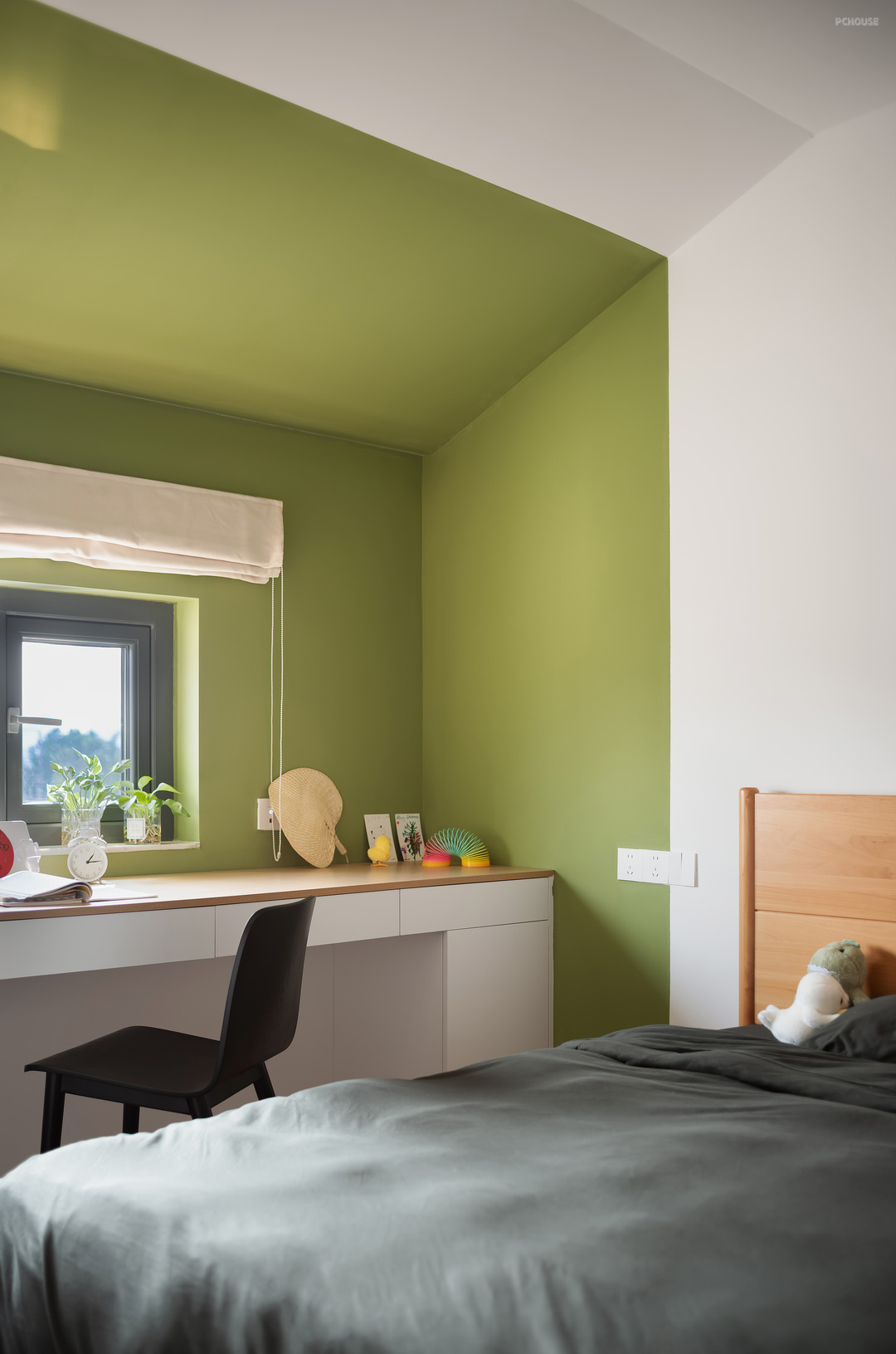 儿童房墙面采用了局部跳脱的橄榄绿作为整个空间色彩的点缀。