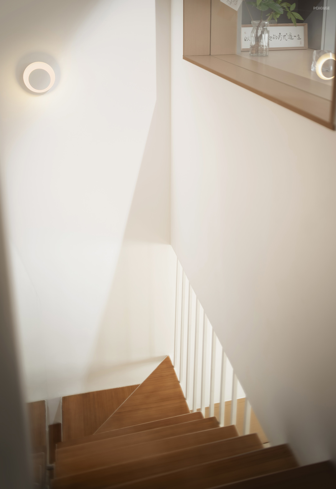 我们在楼梯的平台处的墙面放置了一个壁灯,作为小夜灯使用,踏步的南侧用方管既作为装饰隔断,也可以作为楼梯护栏减少不必要的安全隐患。