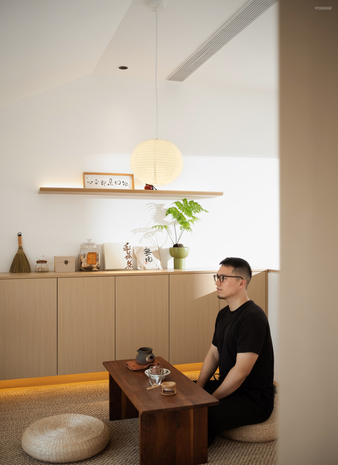 茶室的储物柜与地台下方设置了隐藏灯带,为屋主饮茶提供了更好的空间氛围感。