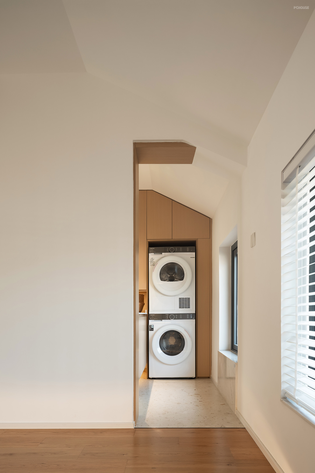 1:卫生间向南内缩,缩小湿区的空间占比,将干区洗漱功能移至卫生间北墙,在靠窗处还放置了洗烘机套装。干区与洗衣区共用了过道空间,而且使其功能更具备灵活性,采光也得到了很好的改善。