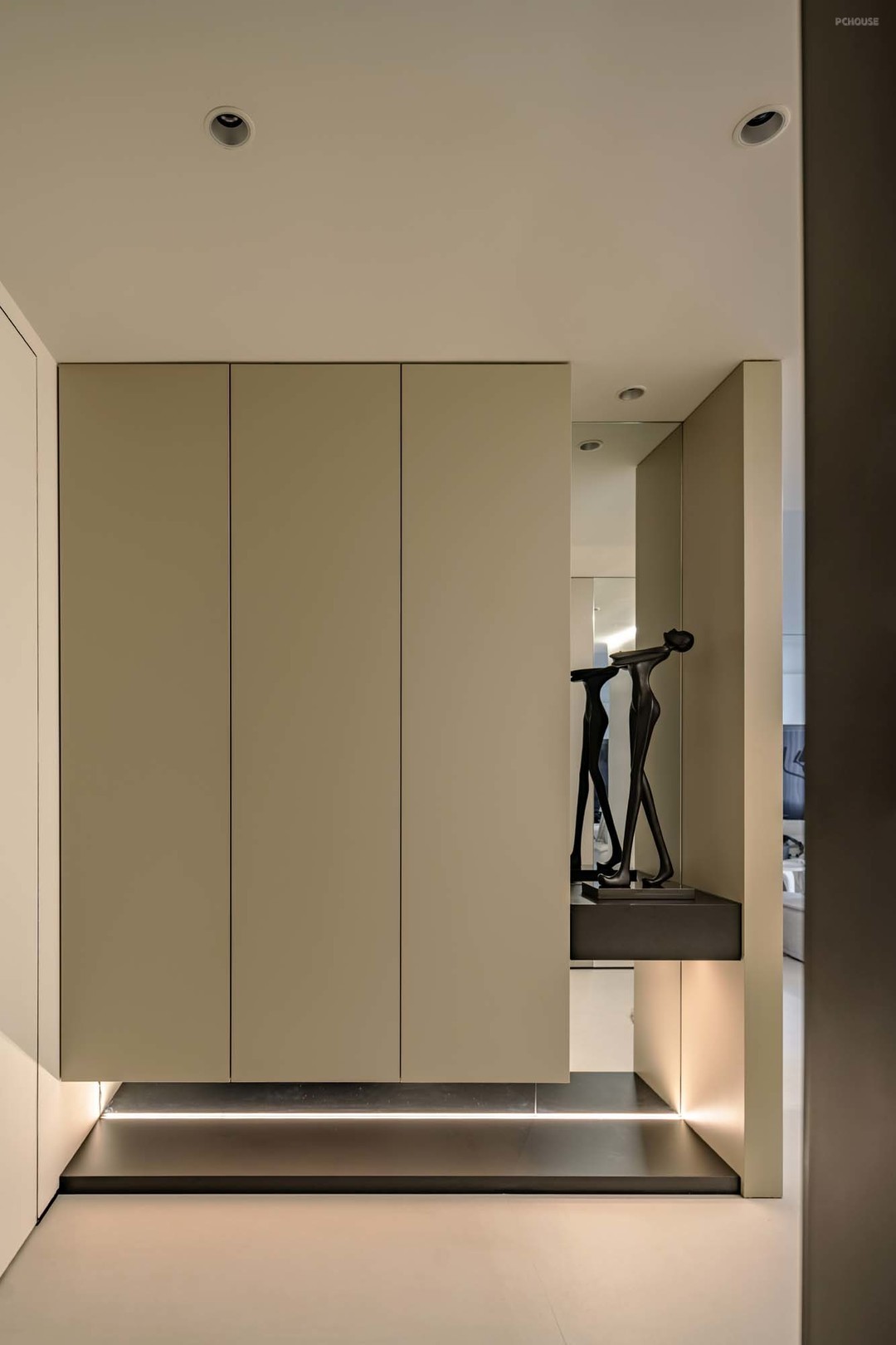 玄关做了两处收纳柜,正对入户门的悬浮柜,既可以作为鞋靴的收纳区,也形成了玄关与室内空间的隔断,避免进门后一览无余的尴尬,以明镜饰面作为背景,搭配不落地造型,底部安装氛围灯带,杜绝柜体的厚重感,更显精致轻盈。
