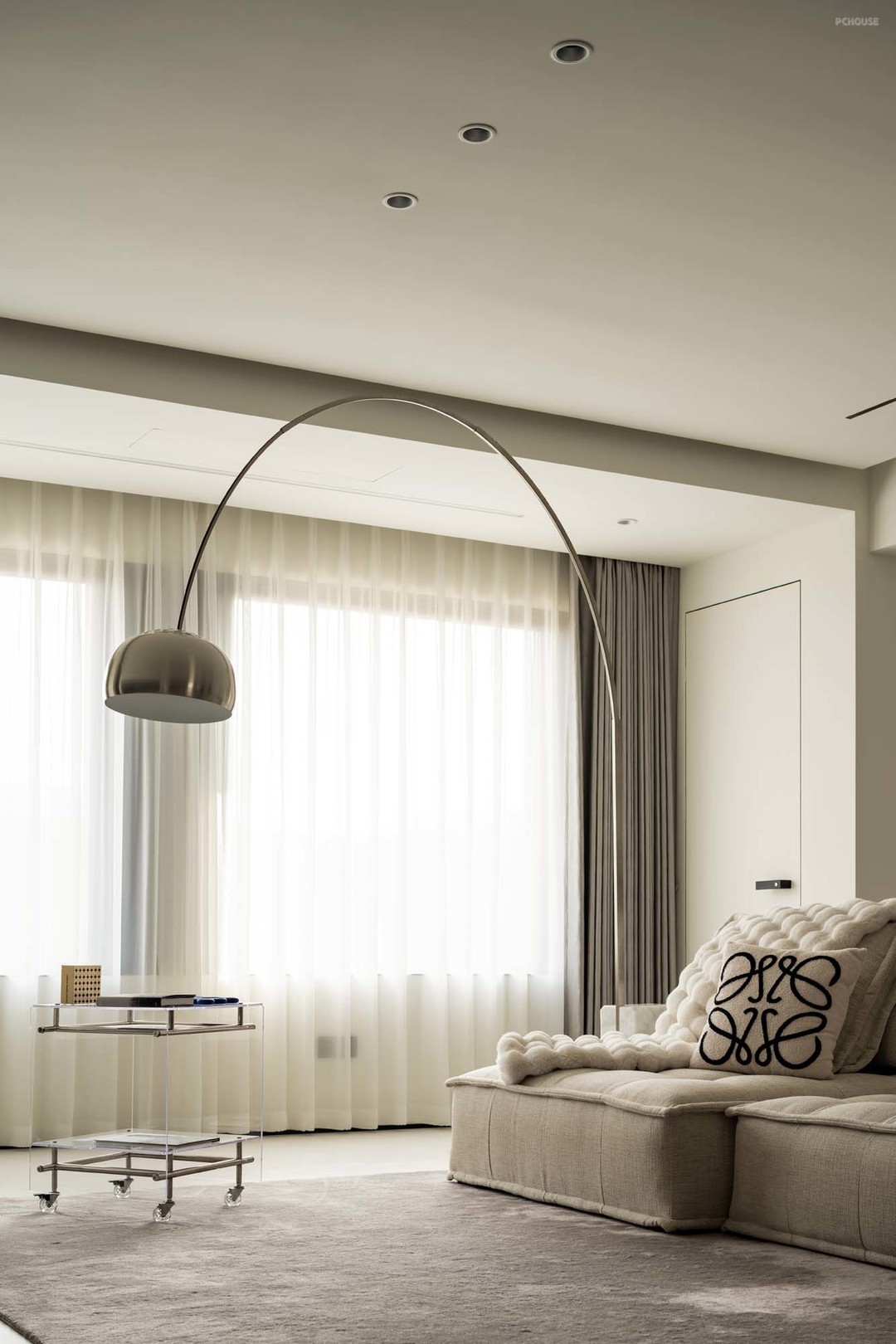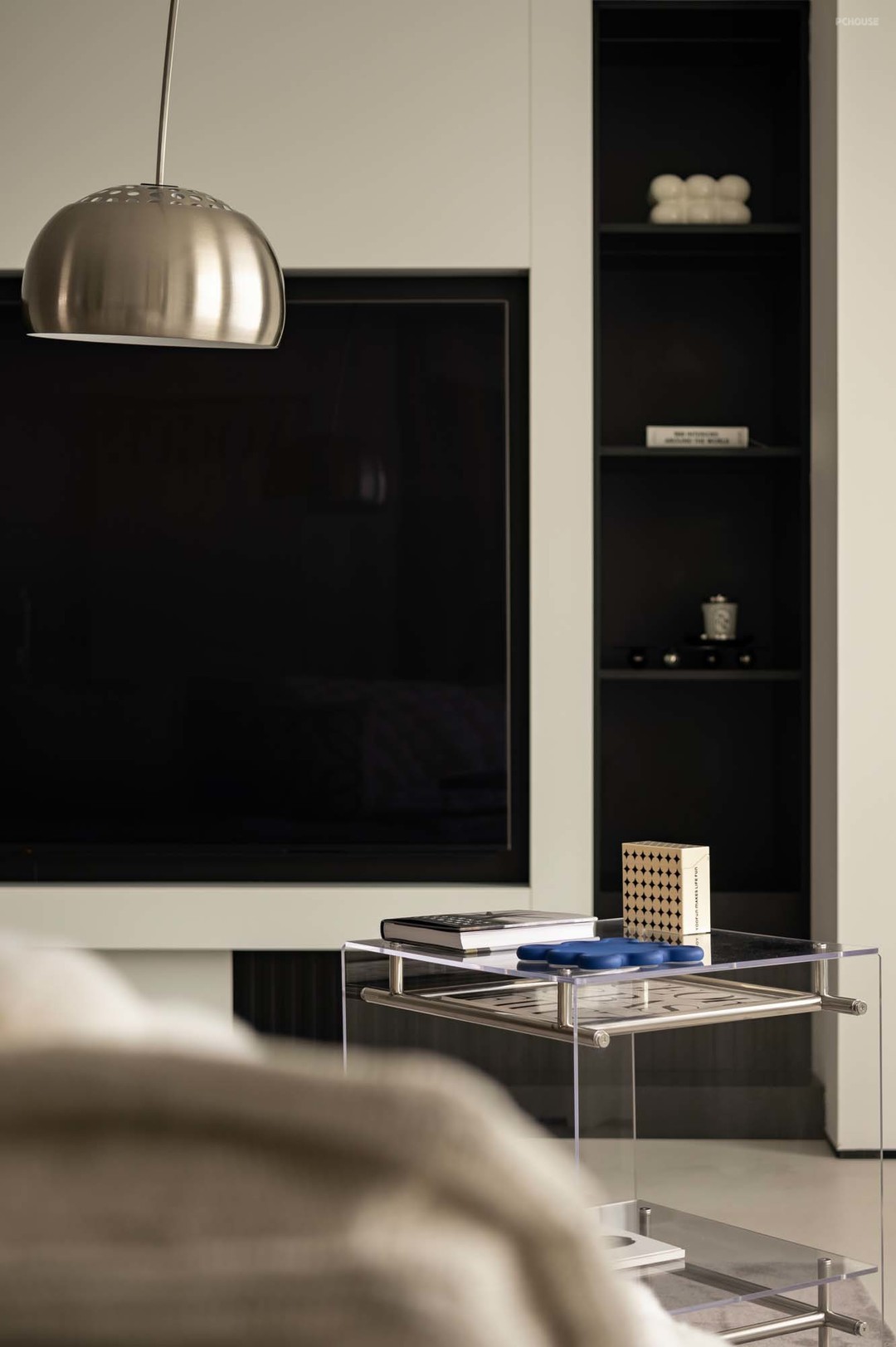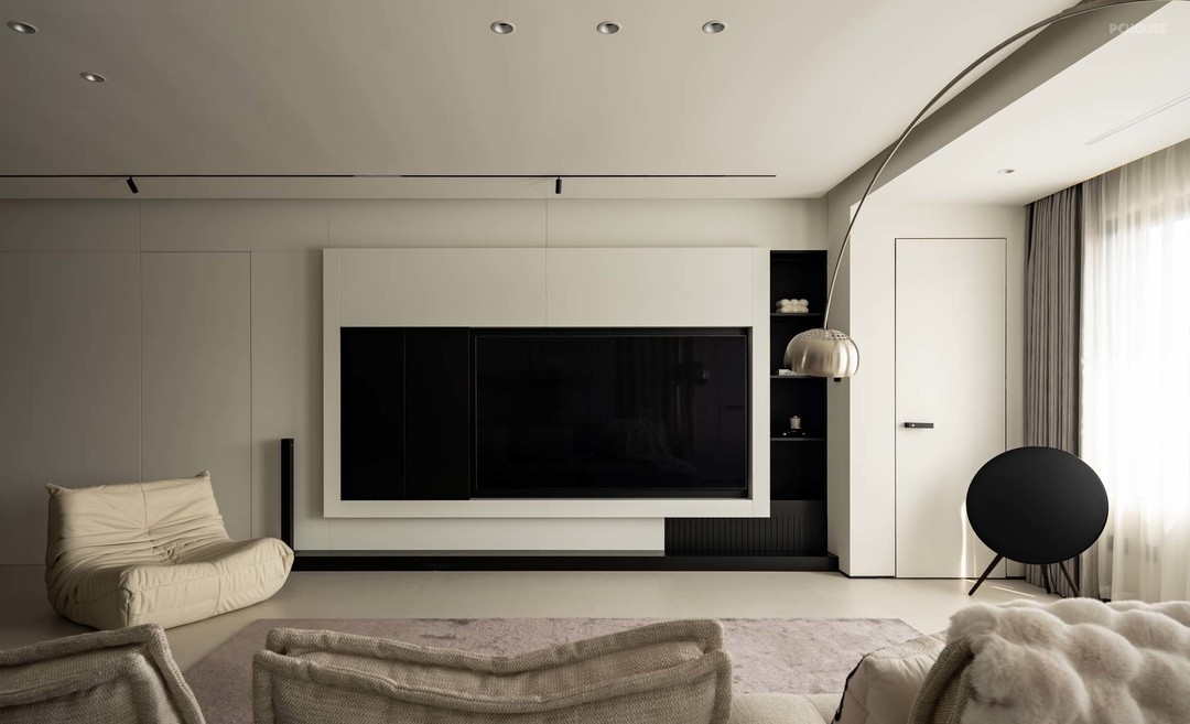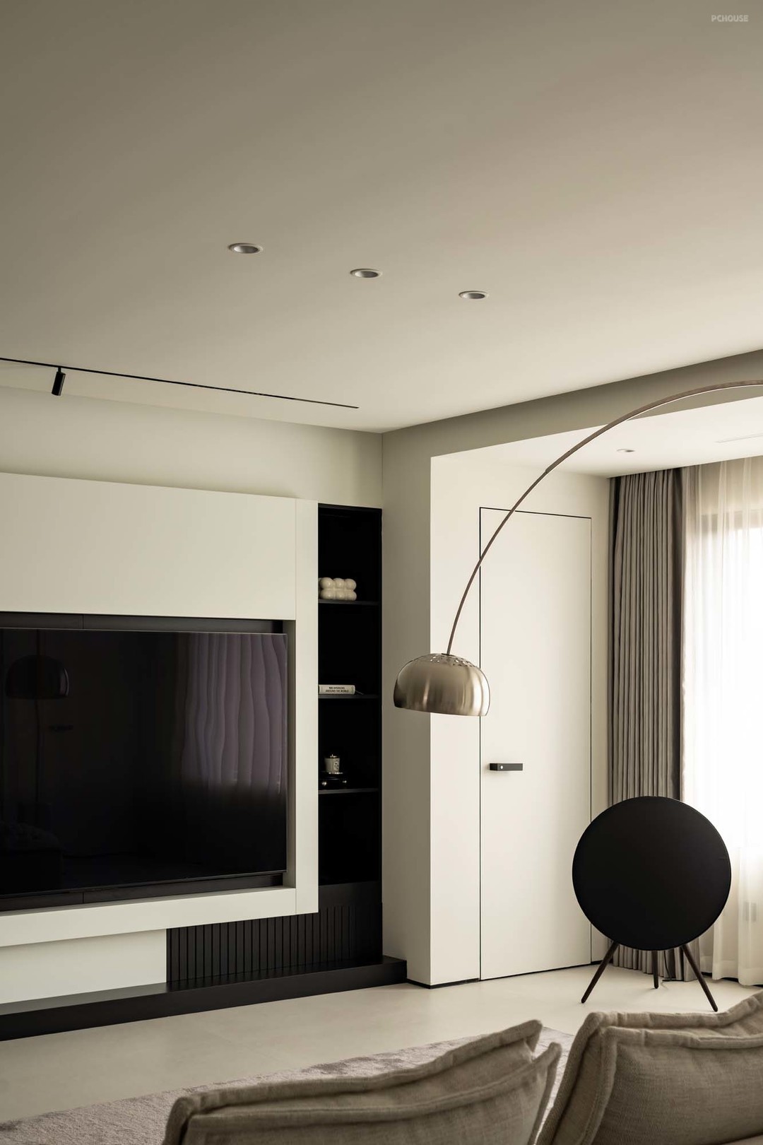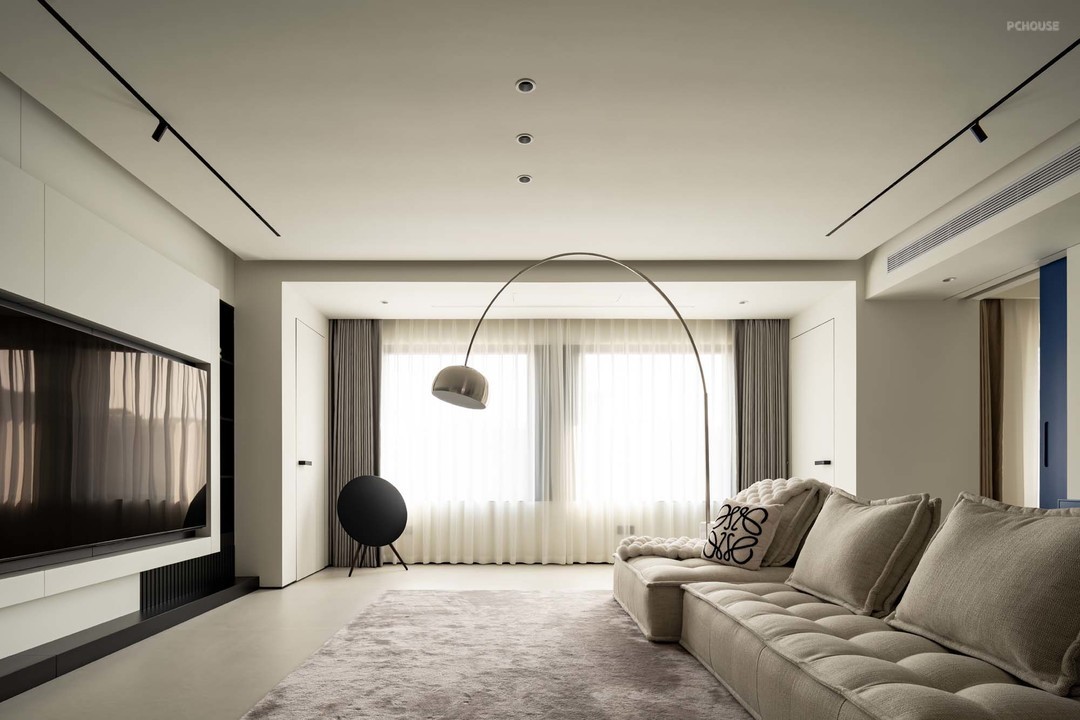 客厅打造墙顶一体的视觉融合感,极简悬浮顶搭配无主灯设计,点状筒灯和线状轨道灯成为主照明,视觉上拉伸层高,钓鱼灯填补沙发角落空缺,让客厅的光源层次更加丰富立体。