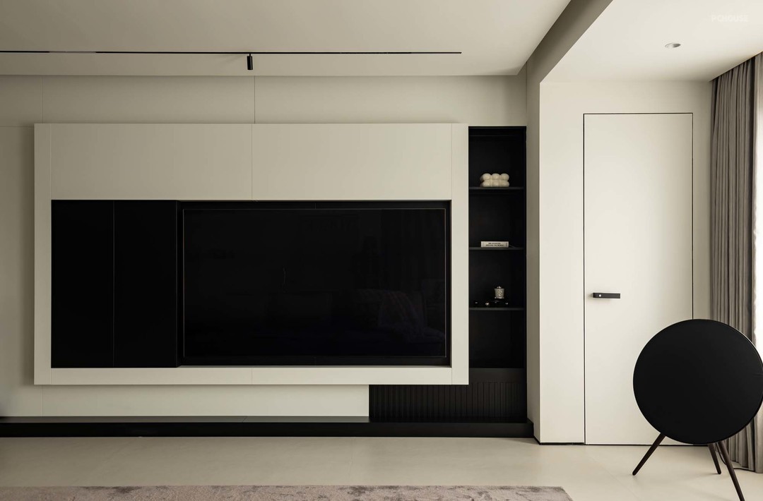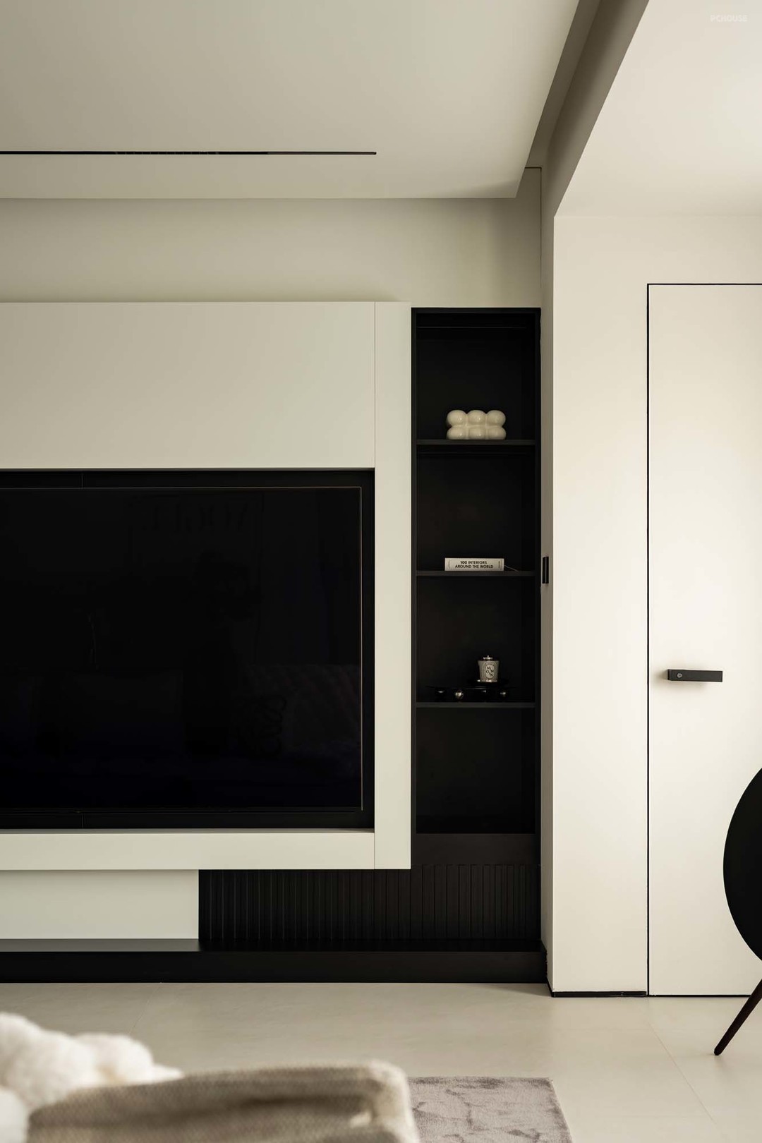 电视墙底部以石阶完成与地面的过渡,最底层采用黑色格栅强化层次感,增设开放格柜,满足展示型收纳需求。