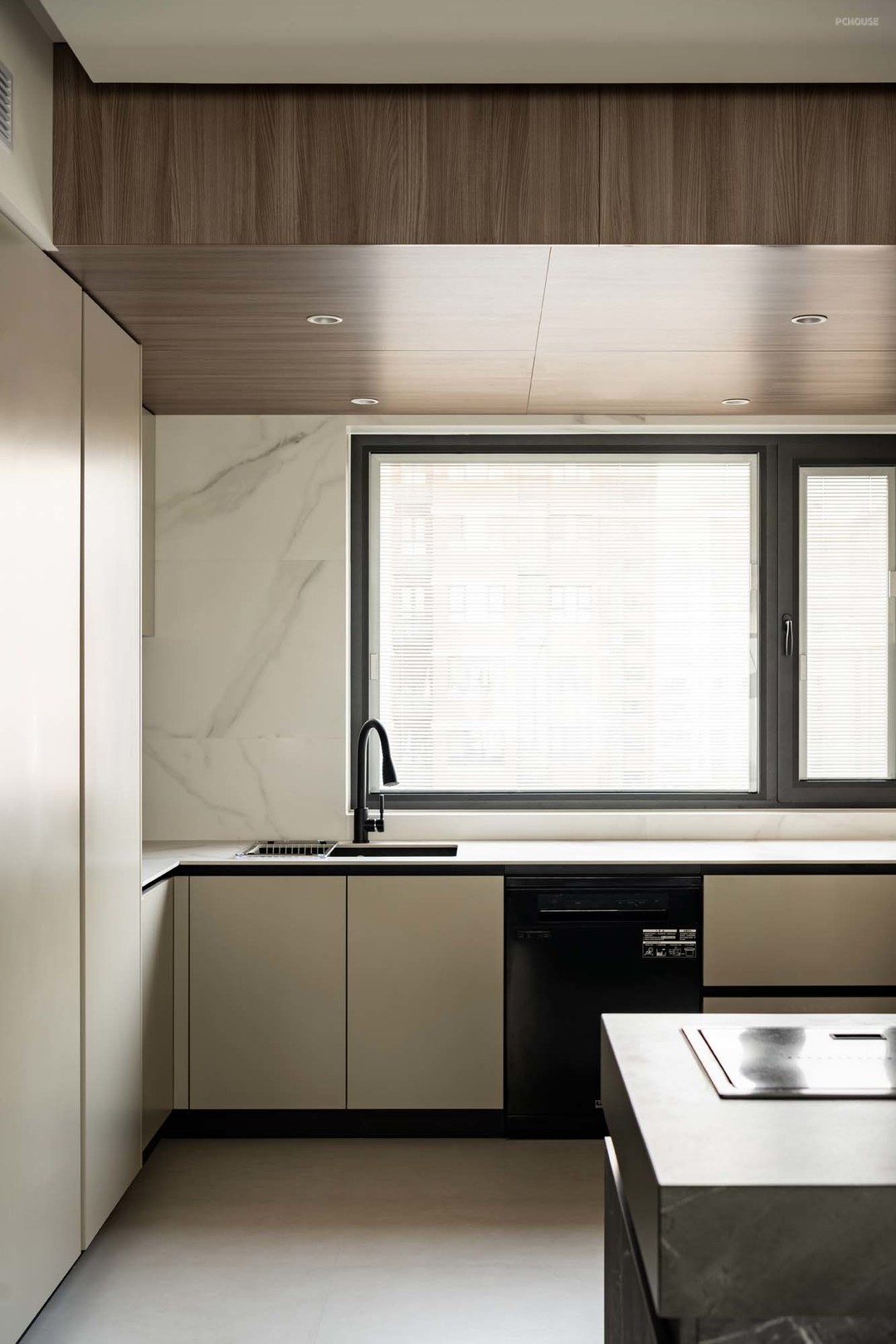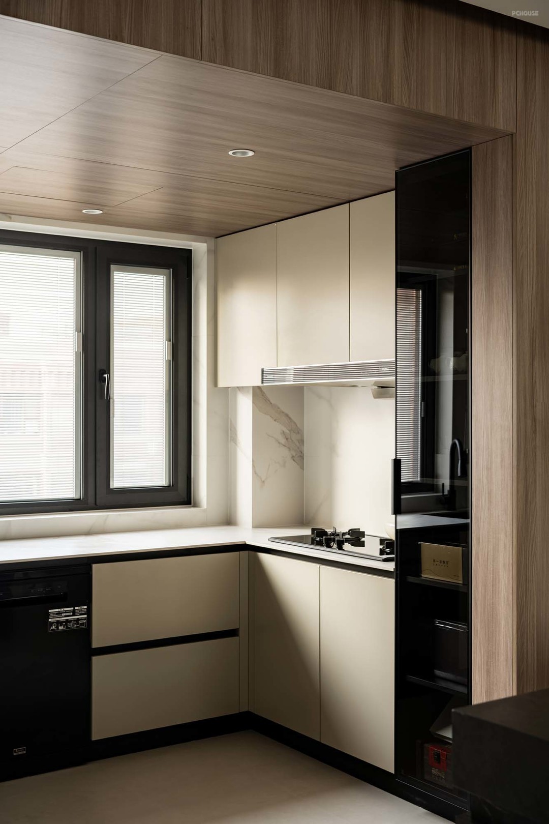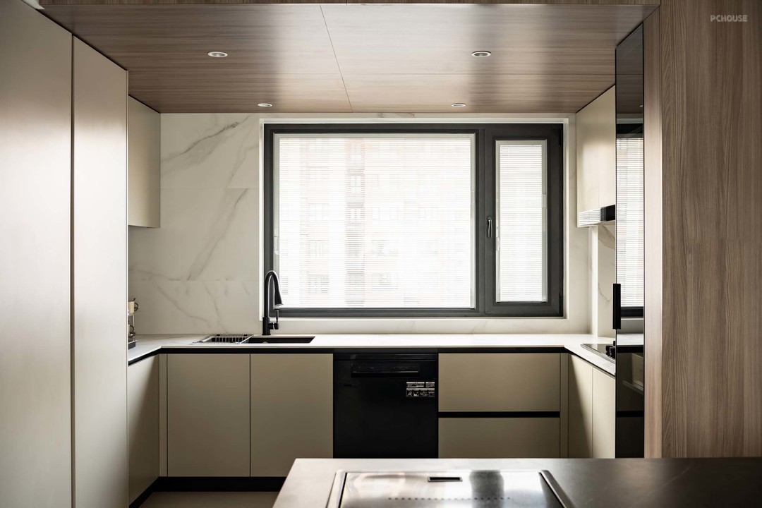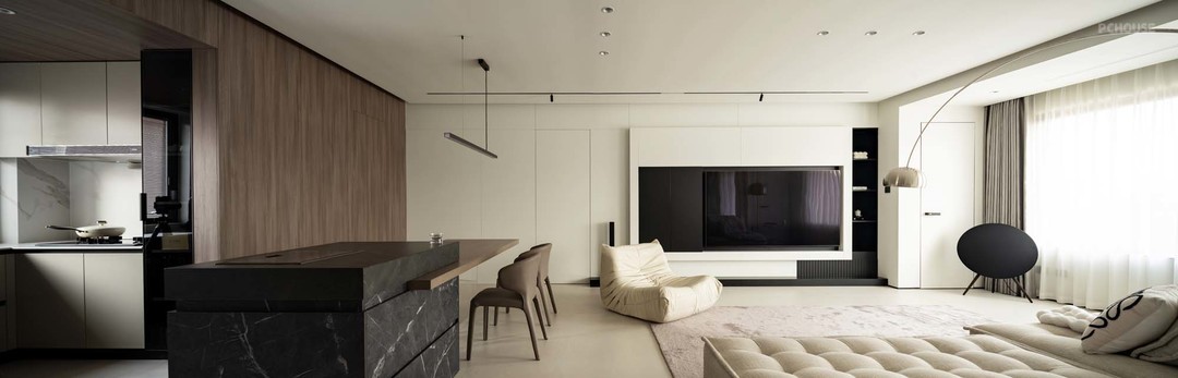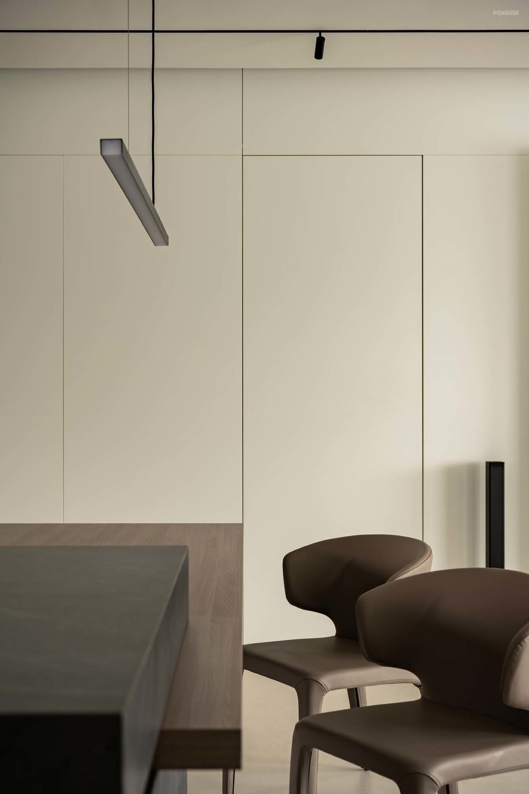 餐岛一体拉伸了餐厅尺度,背后是开放式的厨房,洄游动线的打造让餐厅与客厅与厨房的衔接都变得更为合理。背后木饰面包裹的墙体中藏着通往客卫的隐形门,木的纹理拥有一种原始的质感,这种温润自然的元素会让空间显得更加舒适。