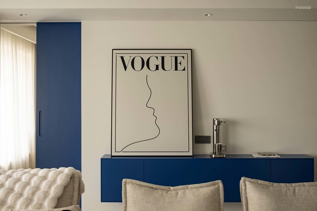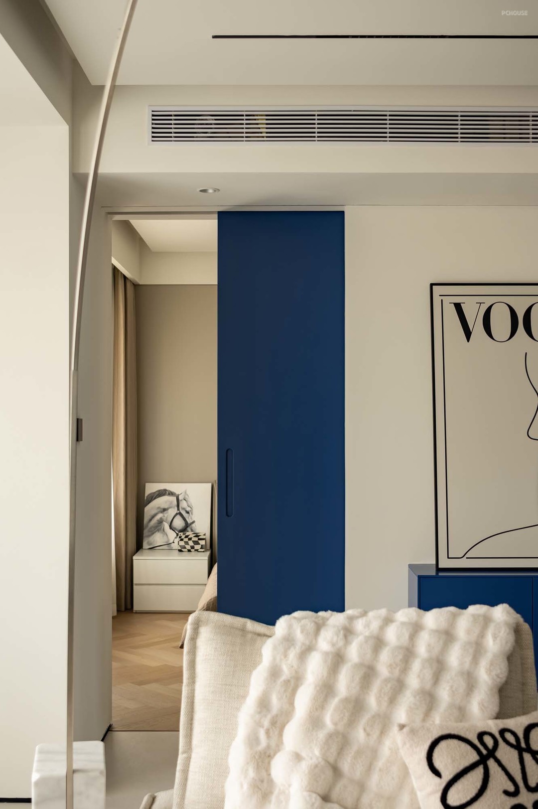 次卧的克莱因蓝移门与内部温柔风格形成鲜明反差,完成客厅到睡眠空间的过渡,也打造了“一门一世界”的意境。
