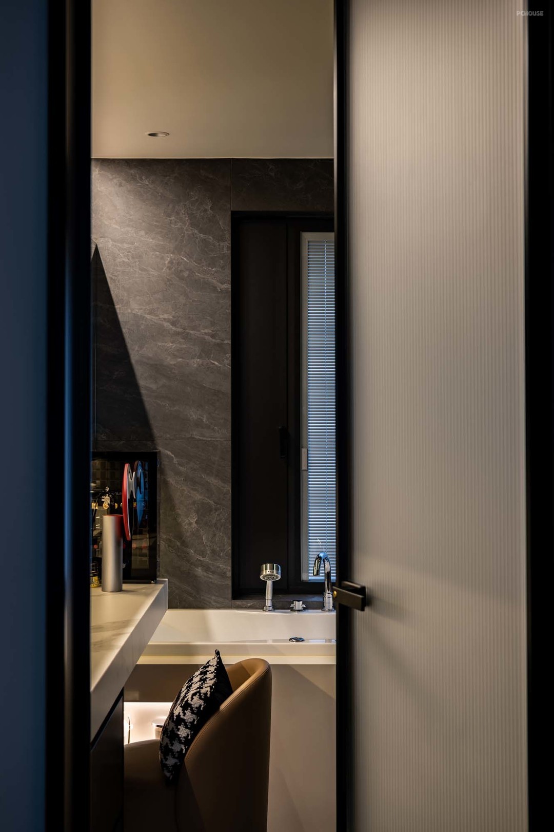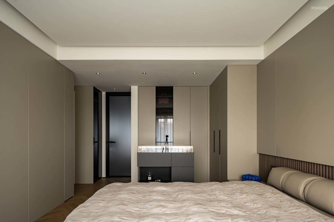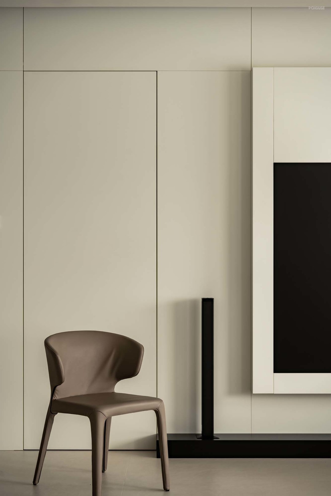另一侧主卧室的门采用隐形门设计,与背景墙保持材质与风格的高度一致,框架切割工整,视觉上成为与周围的墙面融为一体,增加空间统一感。