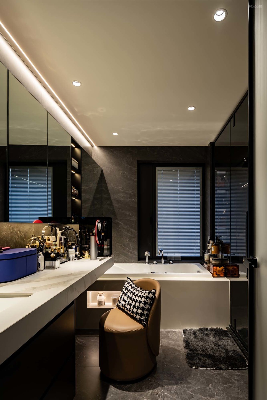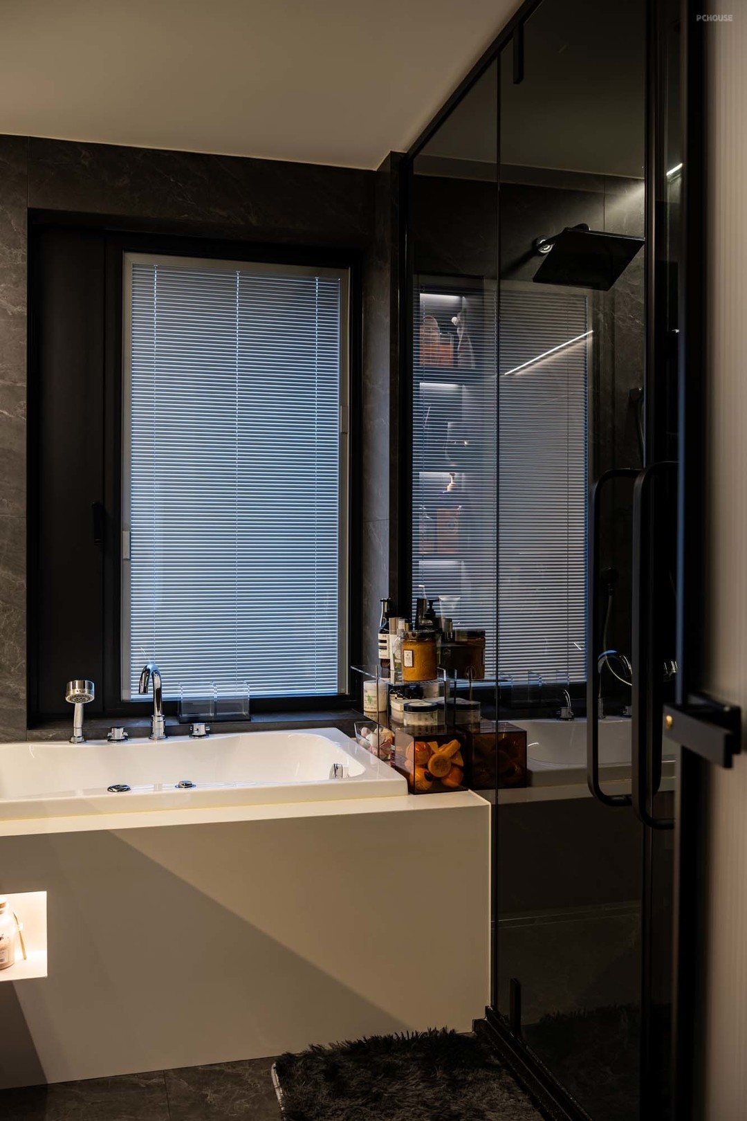 主卧卫浴做四分离设计,淋浴区与马桶区用玻璃隔断单独分离,干区做嵌入式大浴缸,满足屋主的泡澡需求,洗漱台融入梳妆台功能,一台两用,方便清洗,减少卧室的空间占用,镜柜收纳一直延伸到浴缸的上方,确保卫浴储物空间的充足性。