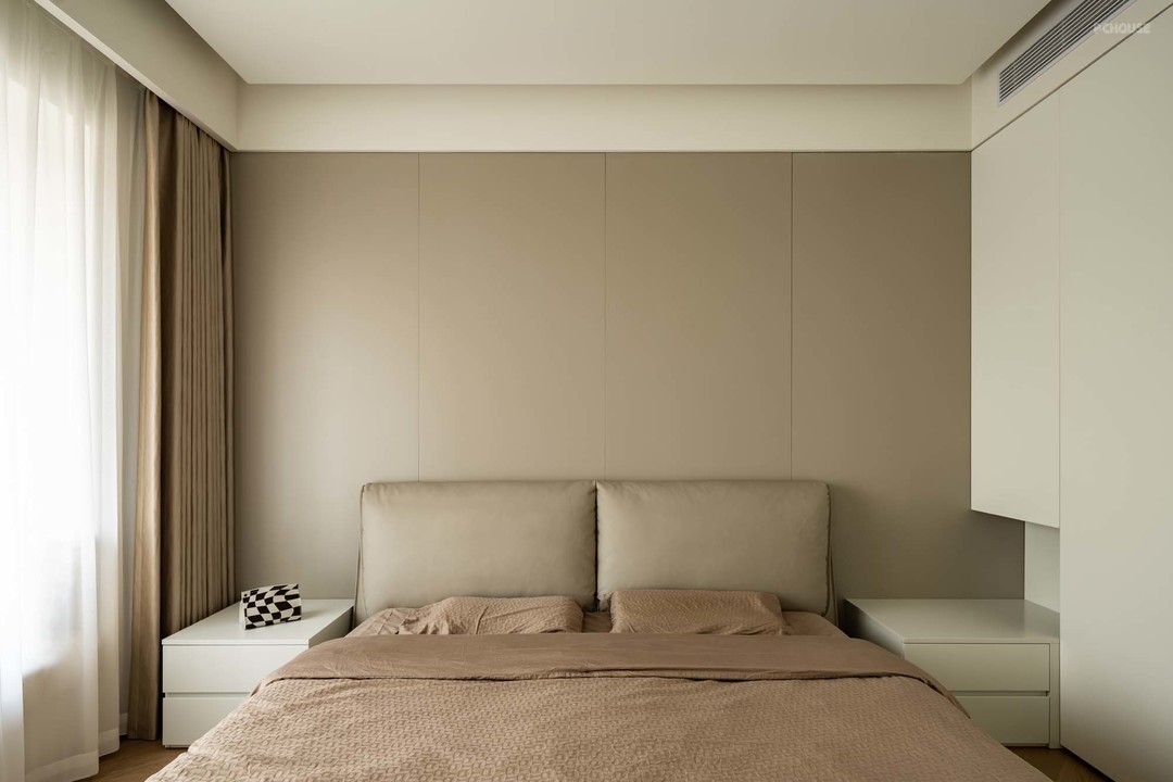 主卧室整合成套间模式后,分为三大区域:睡眠区、衣帽间以及卫生间。睡眠区表现出低调、沉稳的形态,以浅咖色为主调,床头墙分段拼接,融入木格栅元素,边吊搭配悬浮顶,整个空间的层次感立显,也更有沉浸式的助眠氛围。