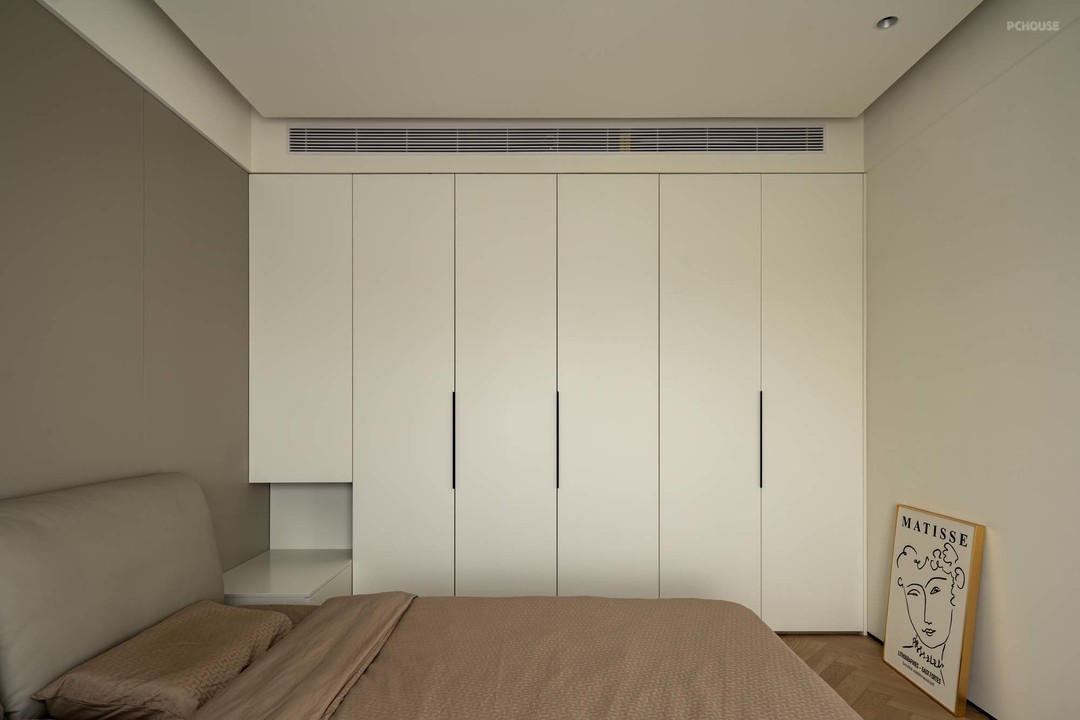 除了这个小型衣帽间,我们在床尾也为屋主增设了一排衣柜,可以将男女主的衣物分开,互不干扰,晨起效率更高。
