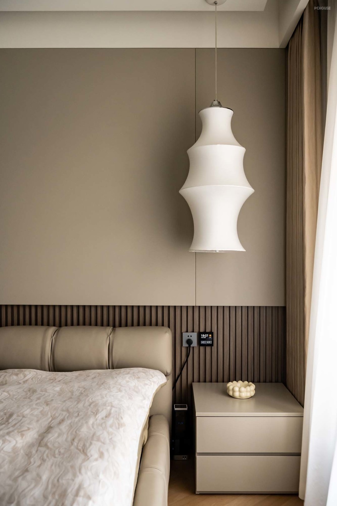 床头悬吊一盏蚕丝竹节灯,漫射光线,柔和且温馨,丰富空间情趣,用简单的美还原生活艺术。