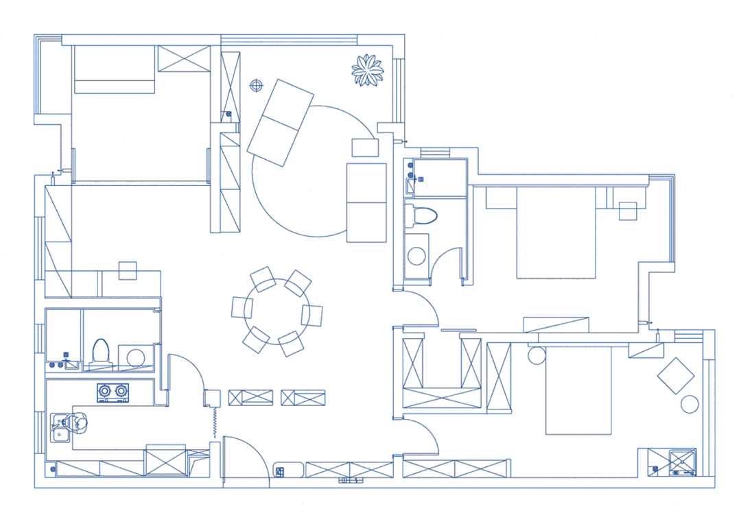 我们尽可能保留原户型开阔的优势,做了以下调整: