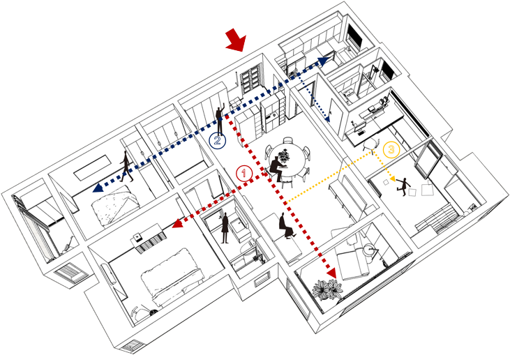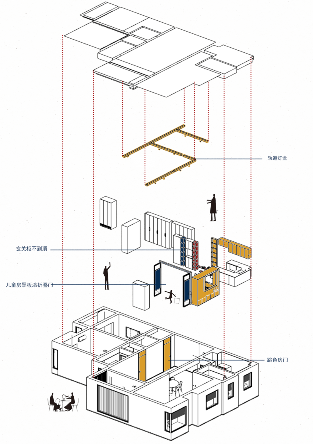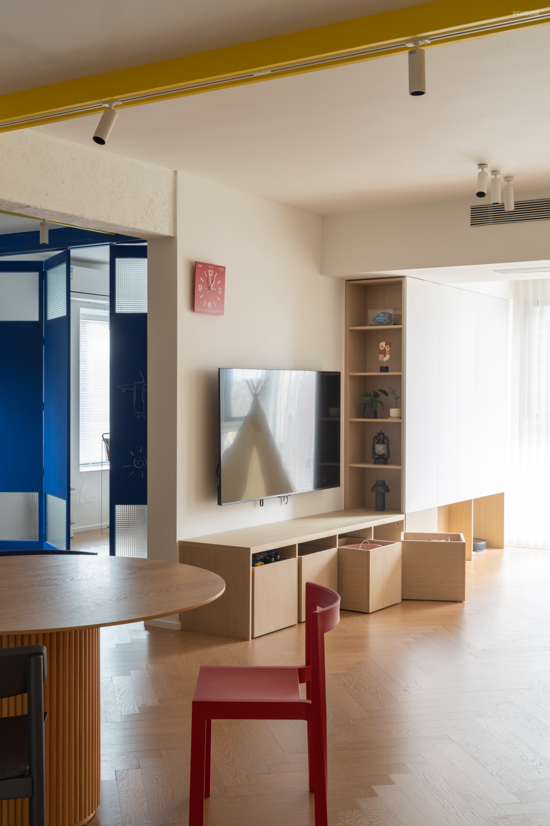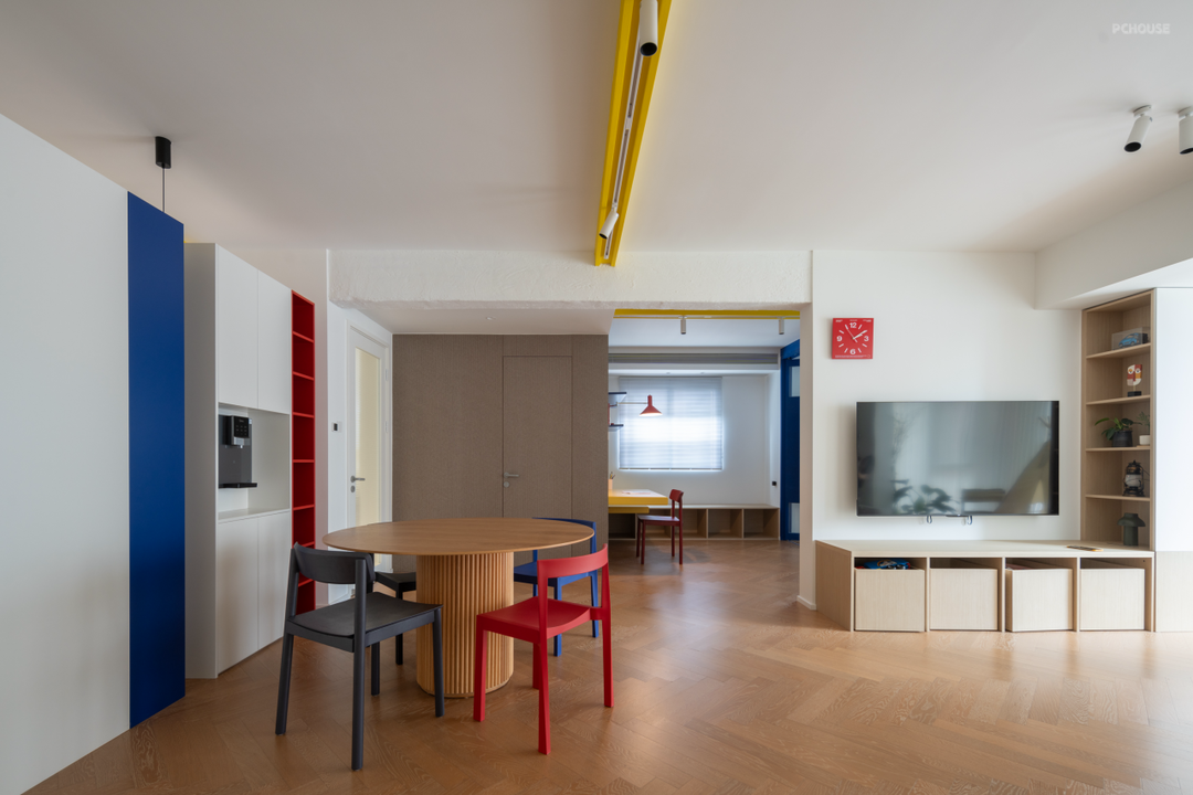 推门而入,柜子的红、蓝、白三色与射灯轨道的黄色让来客一眼惊艳。原本能够被一眼望尽的公共区域现在有了柜子作为遮挡。柜子之间的空隙和不通顶的设计让空间有了不沉闷的透气感。