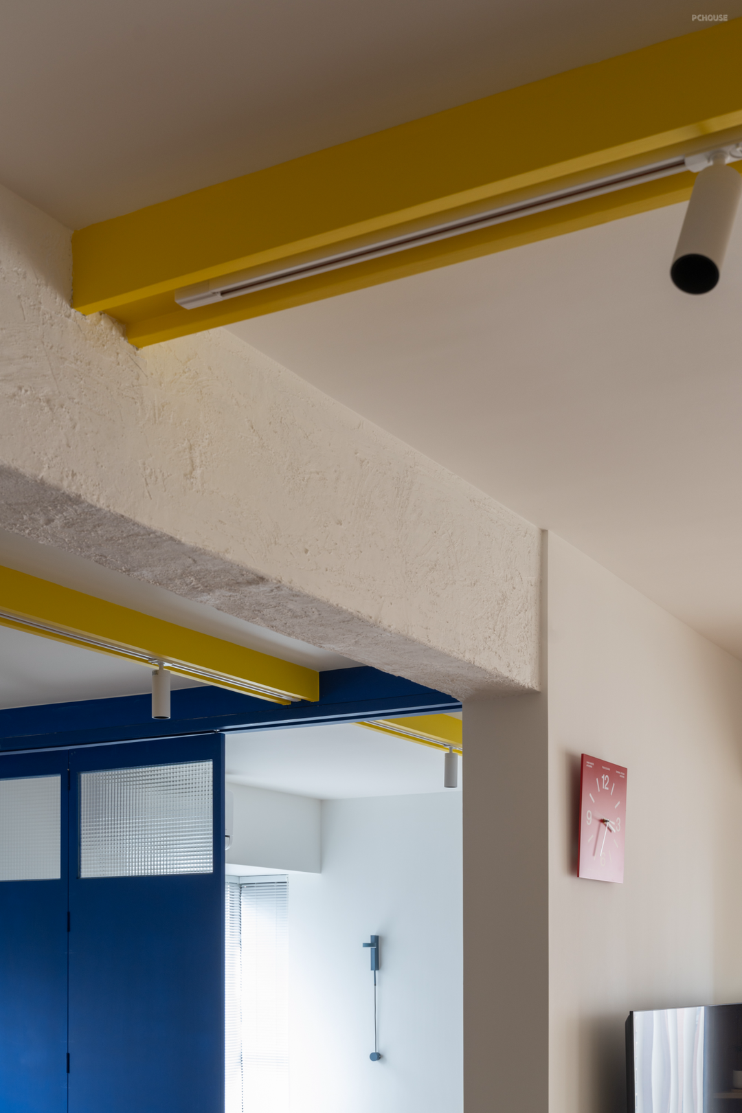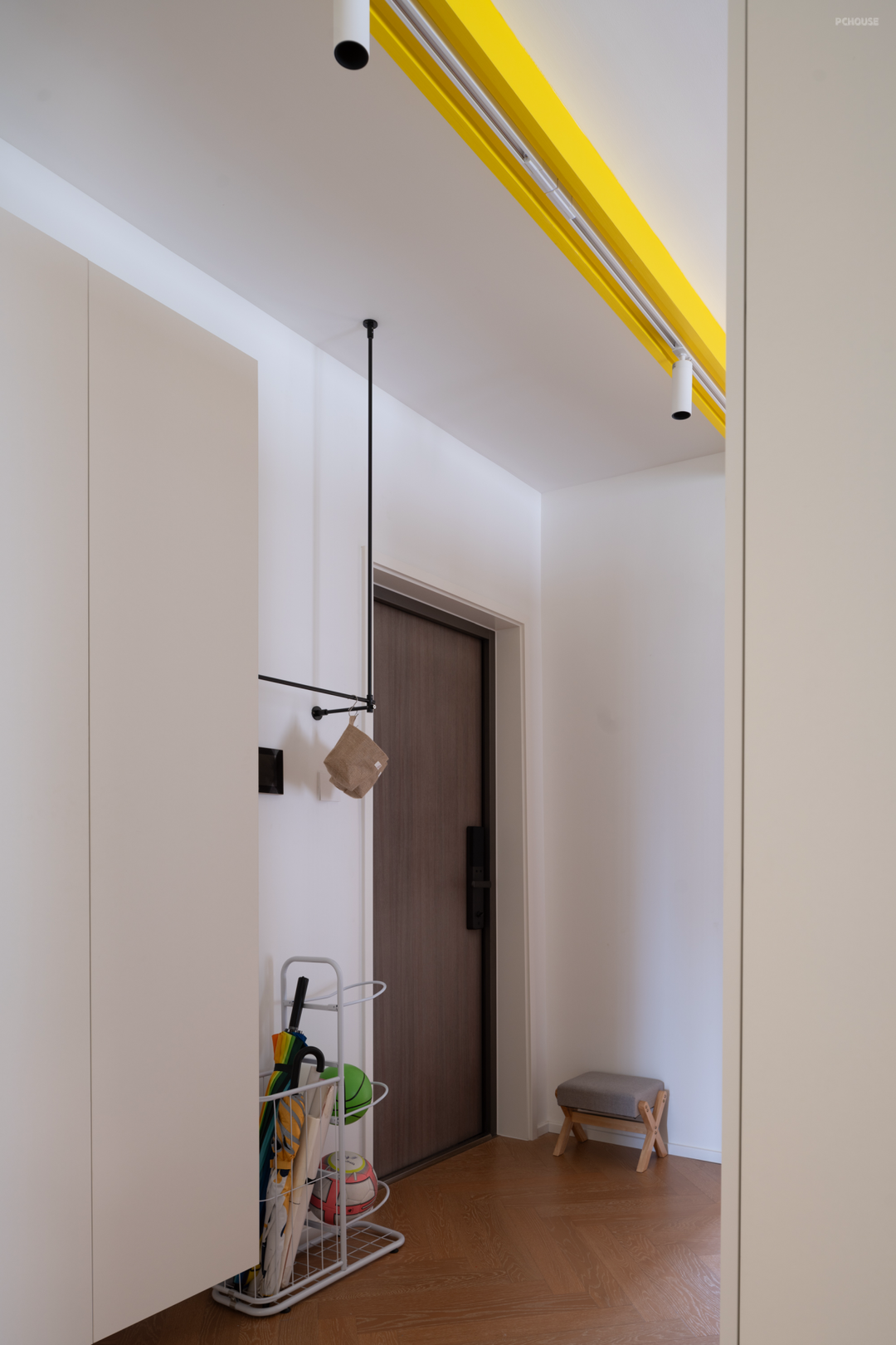 全屋以轨道射灯做主照明,屋主可以根据照明需求对灯光进行灵活调整。黄色造型起着划分空间及引导动线的作用。