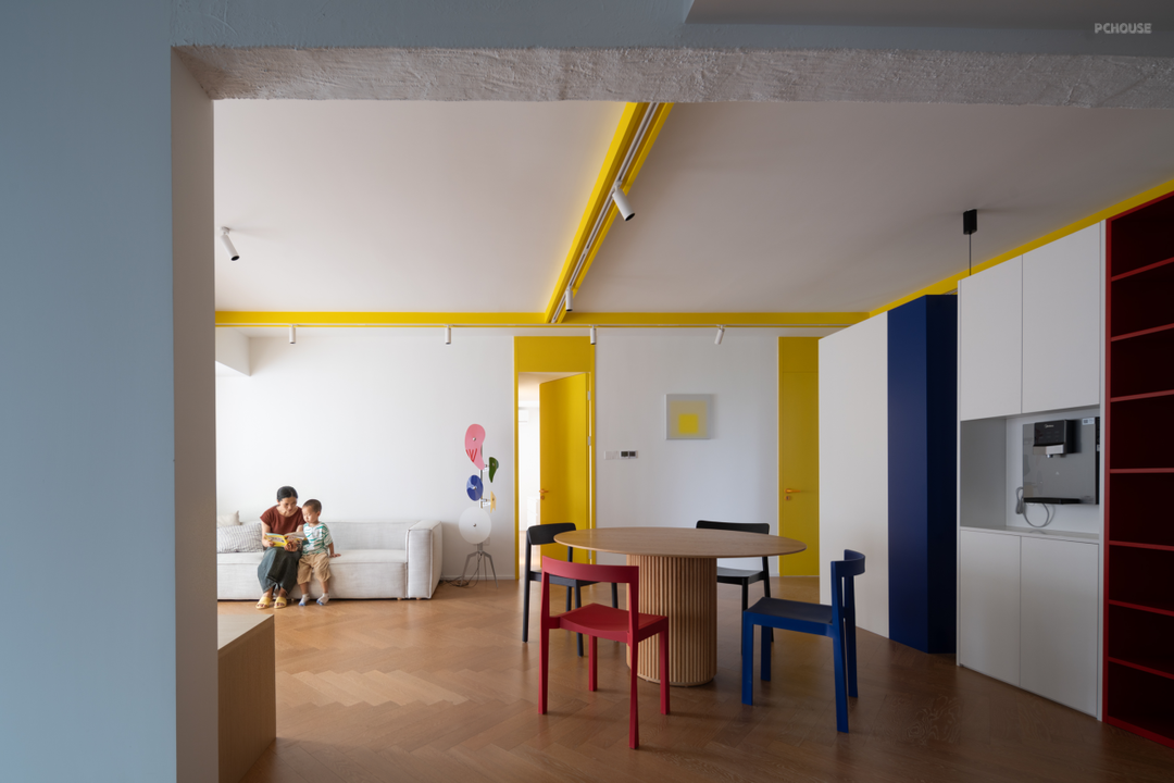 夫妻俩希望打造一个陪伴孩子快乐成长的家。我们最初的思路是打造"儿童乐园"的氛围。后来得知男屋主在车企担任车漆研发工作,本身对色彩的接受度很高。从而诞生了这样一个让大人小孩都能享受其中的色彩之家。