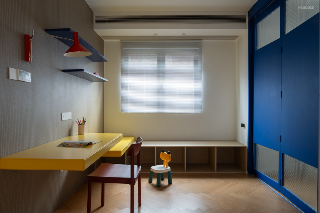 书房保留了三原色的设计,灰色护墙板营造沉浸式的工作氛围。靠窗的位置不仅是一排收纳柜,也是大人辅导孩子功课时的休息区。