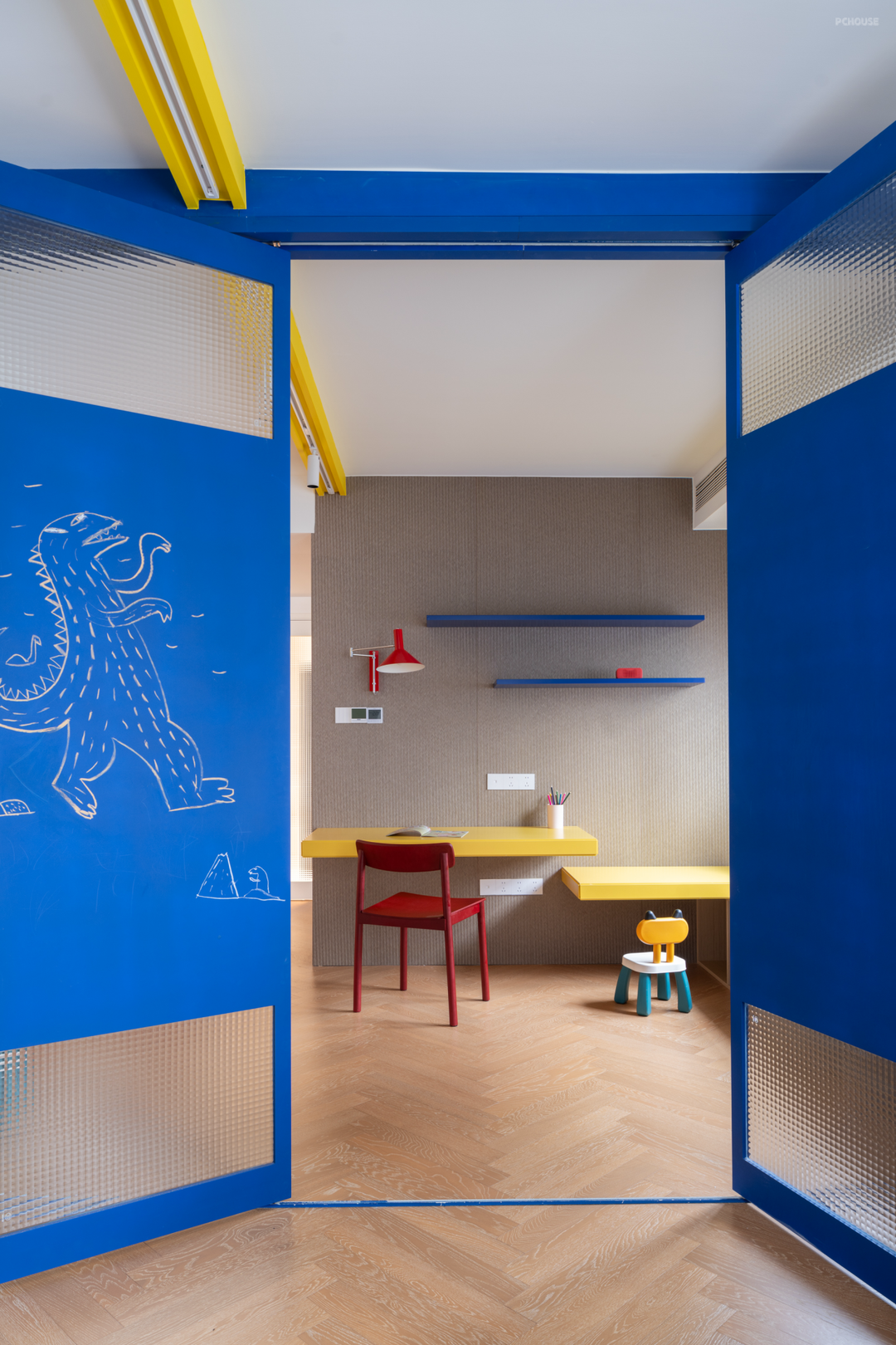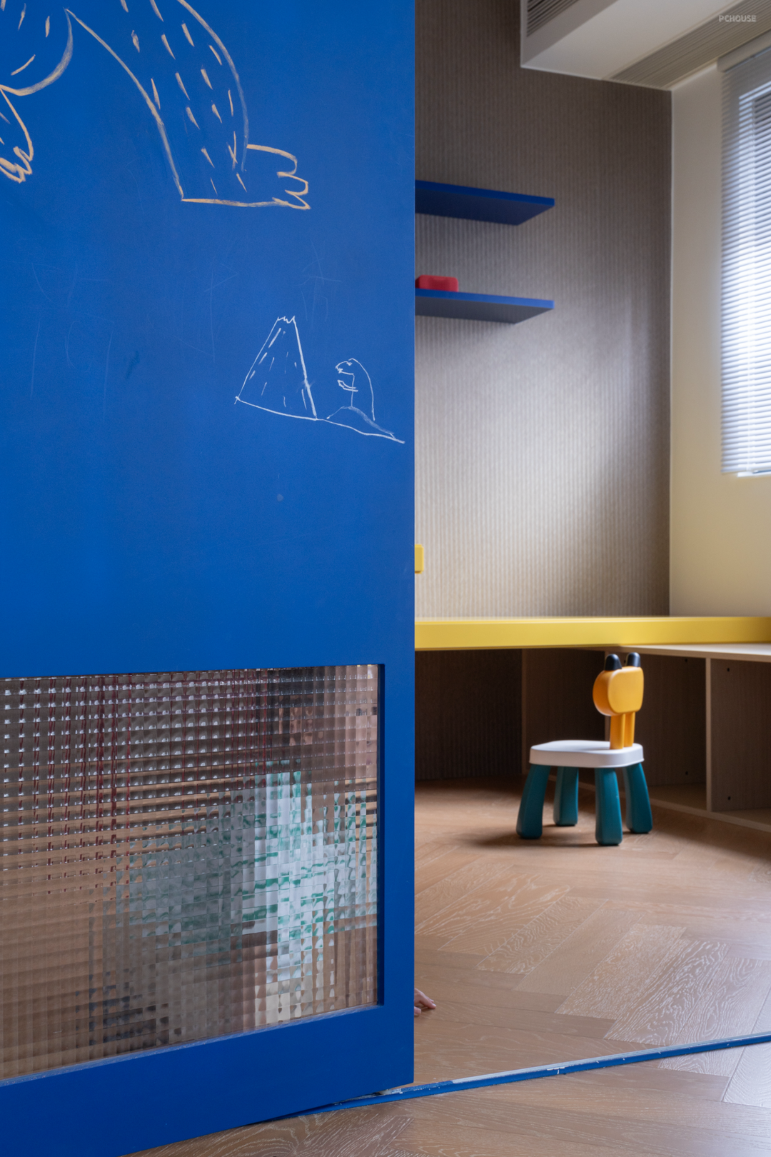 书房隔壁是为二胎的情况准备的儿童房,目前还是小朋友的游戏房。定制的轨道折叠门上刷了黑板漆,可以作为涂鸦板使用,供孩子抒发天性,也可避免其他墙体被孩子涂鸦。