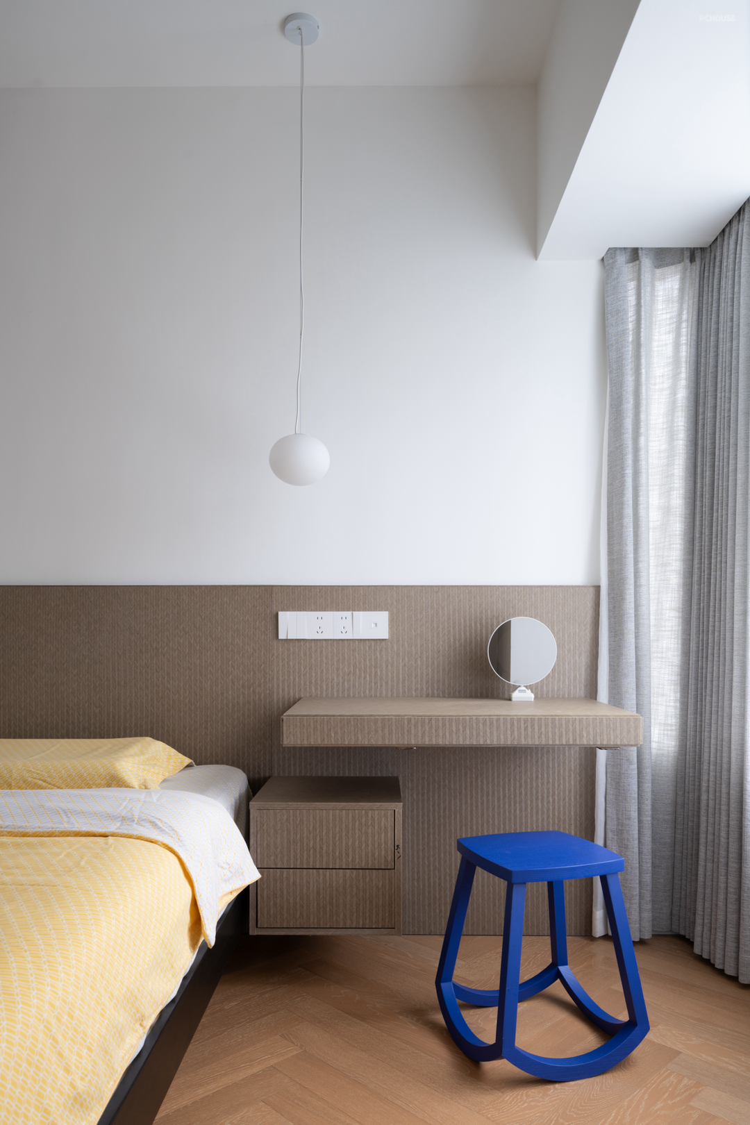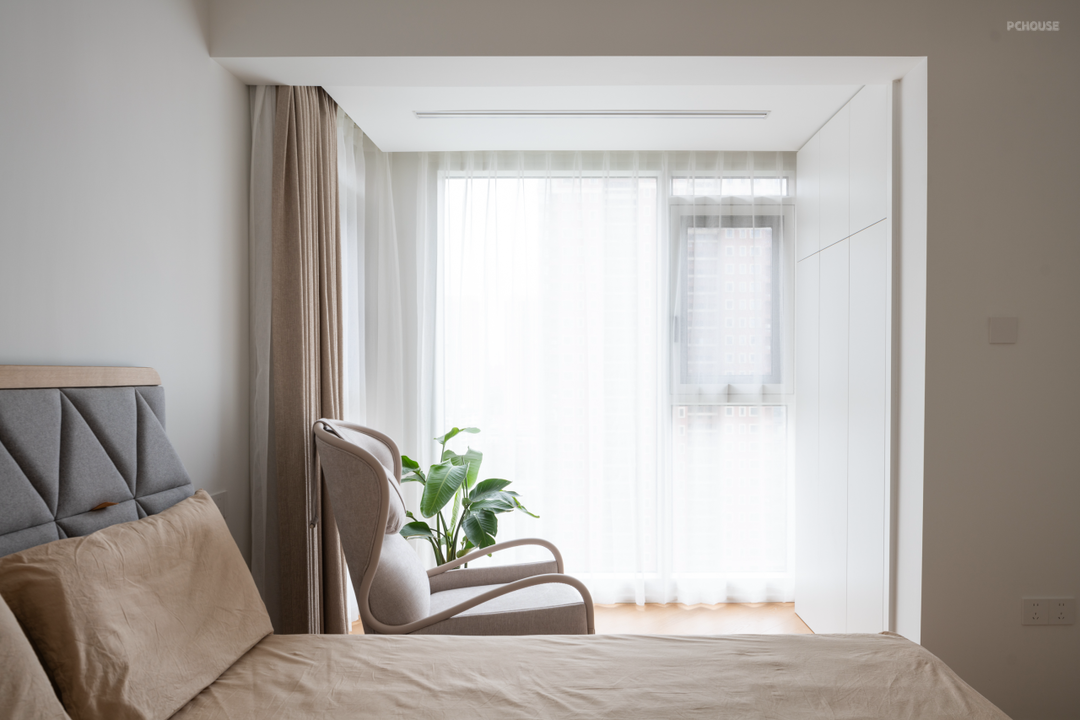 卧室内做了局部吊顶,统一过道、衣帽间、主卫的层高;卧室外则为了配合公区层高,加高了门套。