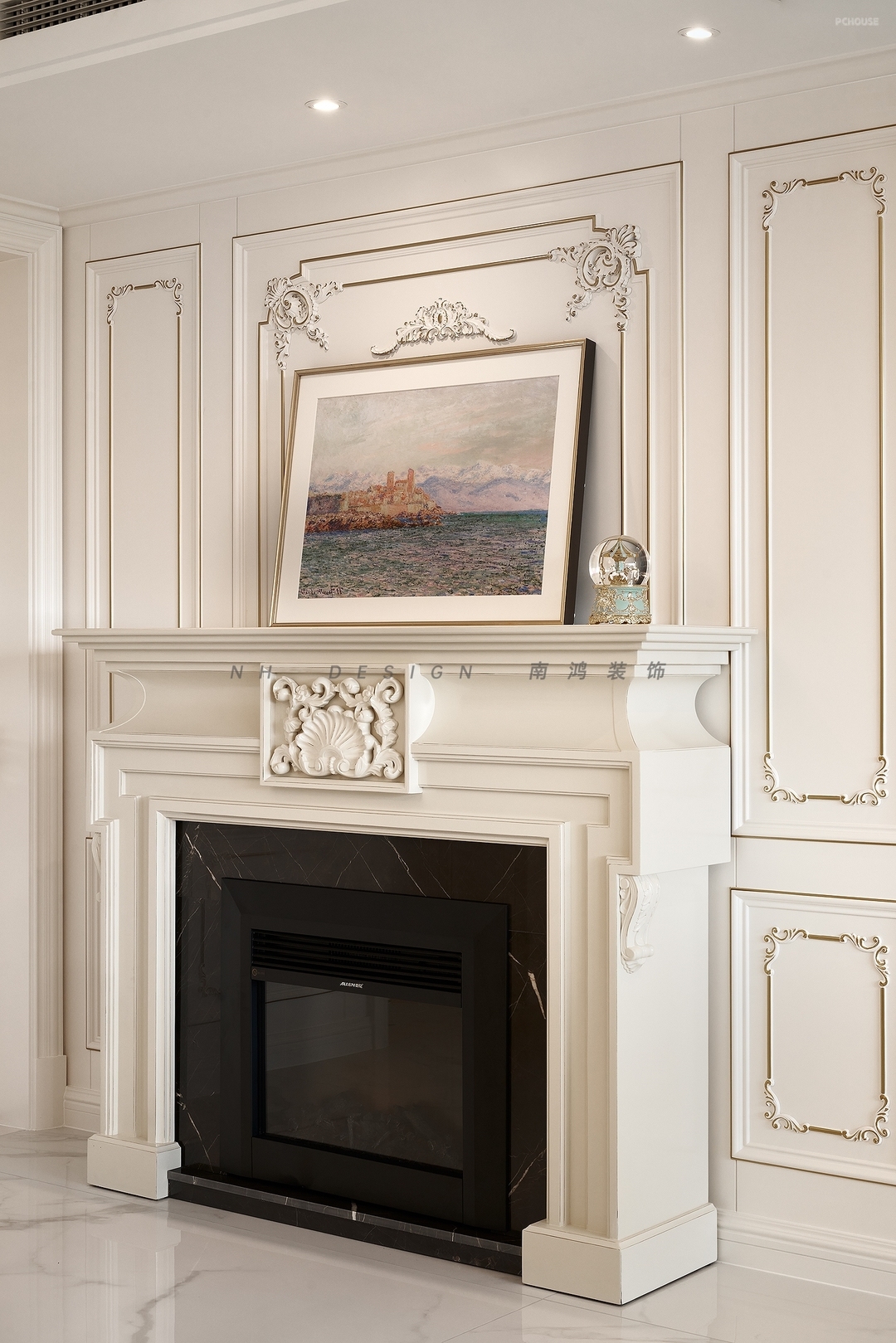 空间整体采用对称的设计手法,以护墙板、金色雕花线条创造出浪漫生动的法式居家氛围;薄荷绿的真皮梦幻沙发质感清新,带来春天般阳光明媚的气息。
