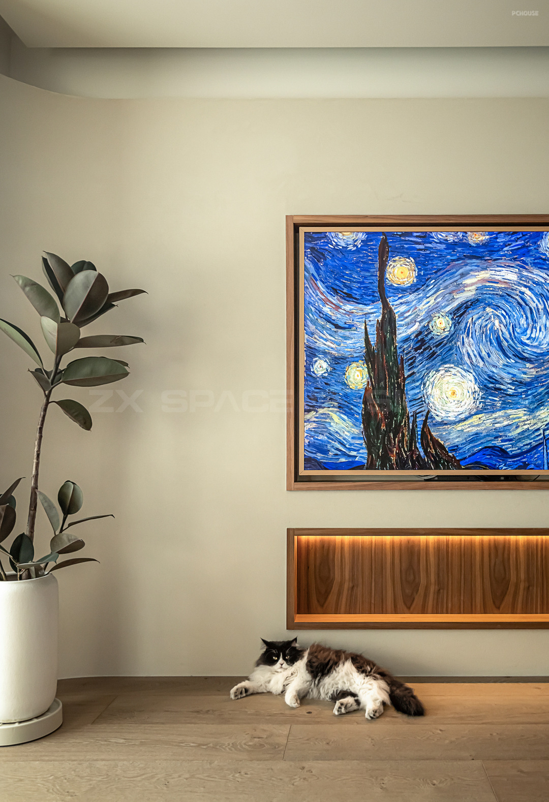 客厅悬浮顶加一圈灯带烘托。猫宝宝的安逸小窝,享受午后懒洋洋的幸福。