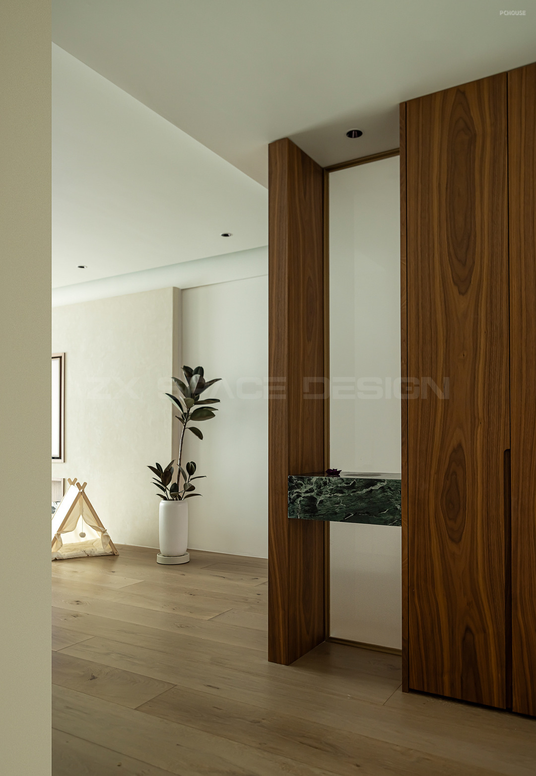 3、过道储物间一分为三,中间为家政间,左右两边分别为儿童房和主卧的内嵌衣柜。