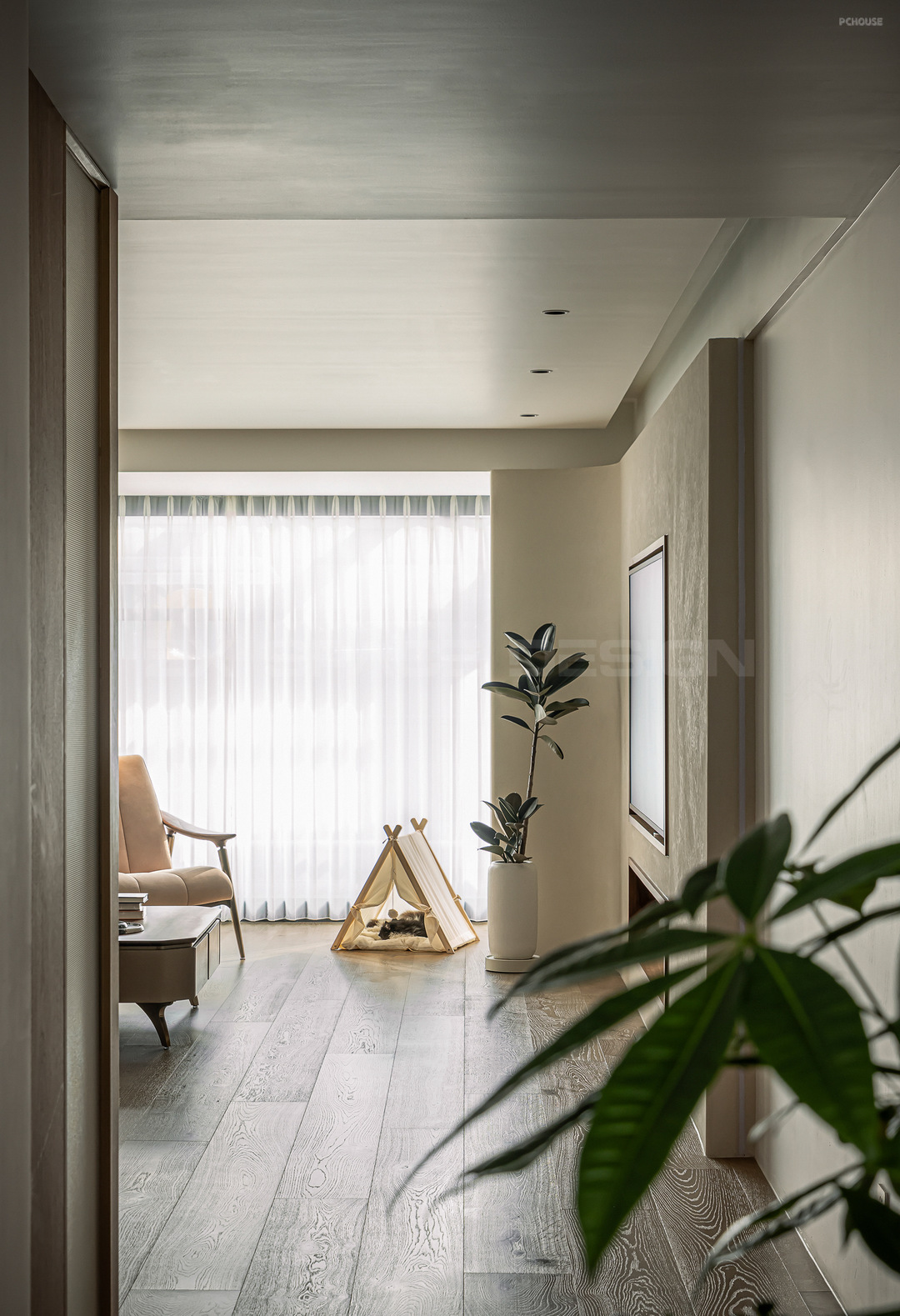 4、分区设计,通过线条造型、材质选择、墙面处理来弱化原本过长的客厅。