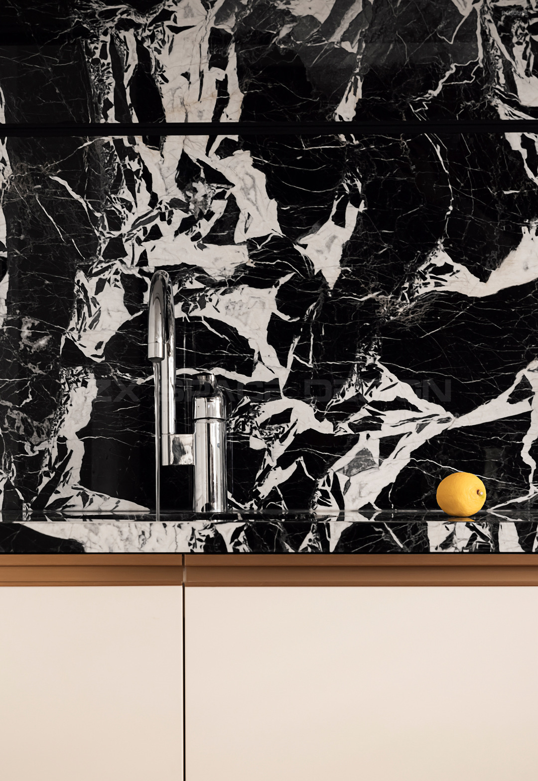 玄关同款普拉达绿石材作为背景点缀。黑白琴键,随时光跃动,谱出生活新乐章。