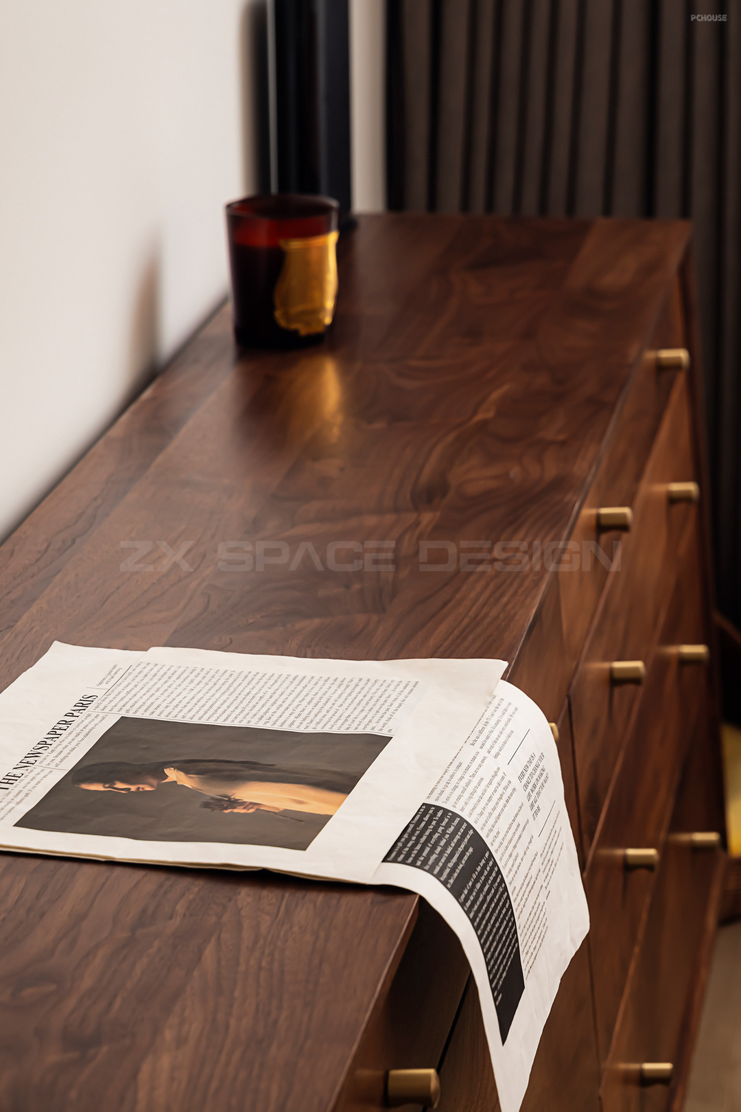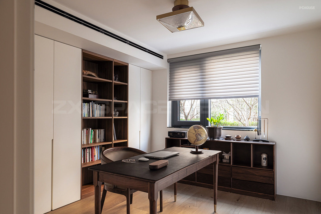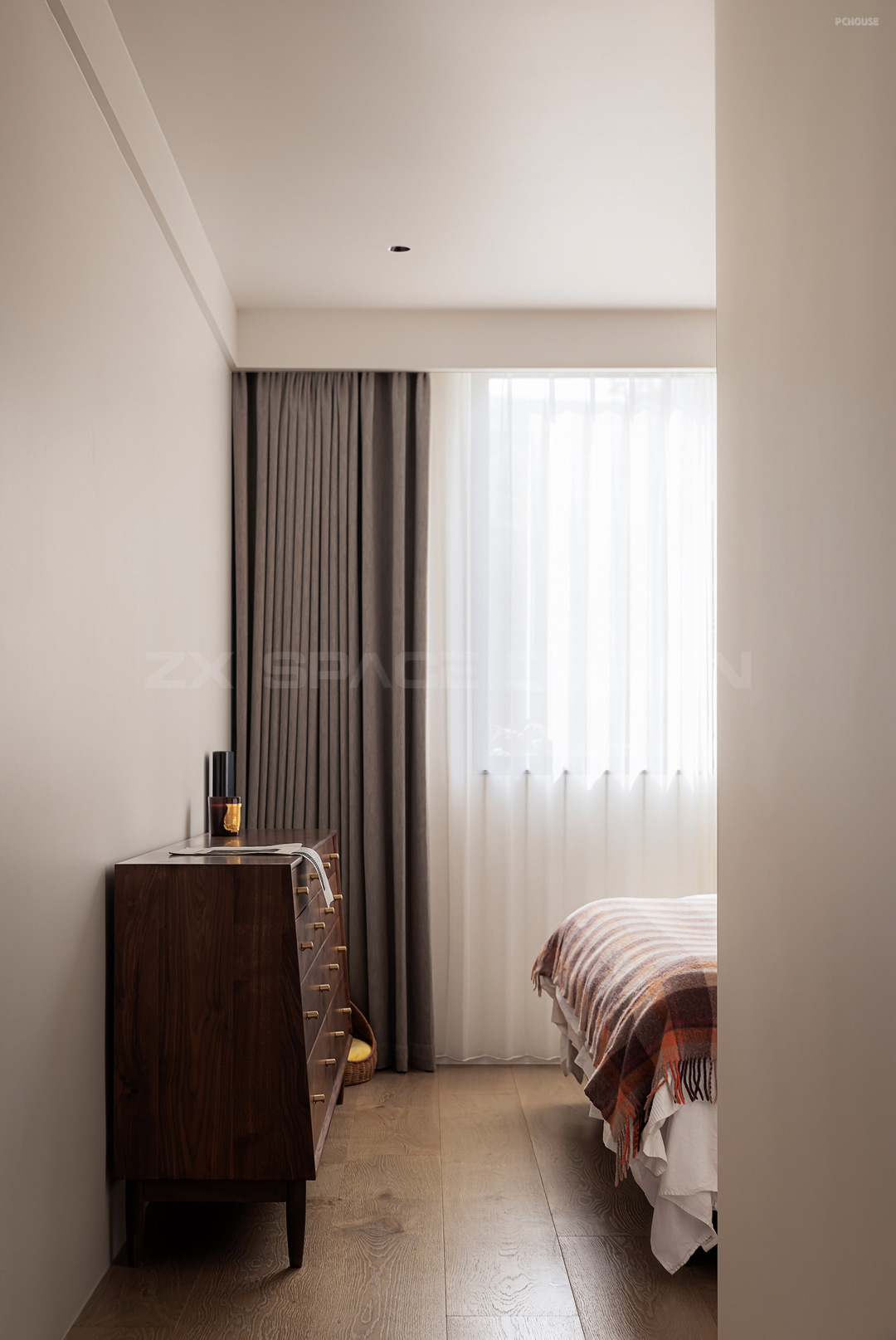 现代混合新中式风,卧室满满沉静文雅气质。地板为1米8长板拼铺,更加大气。