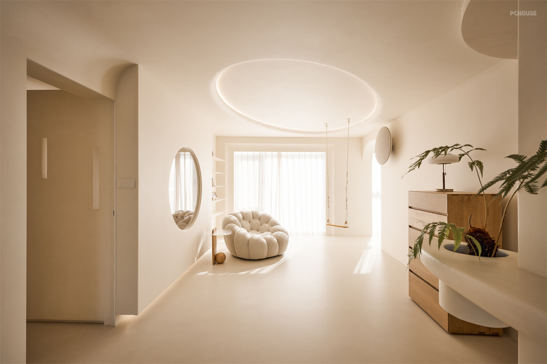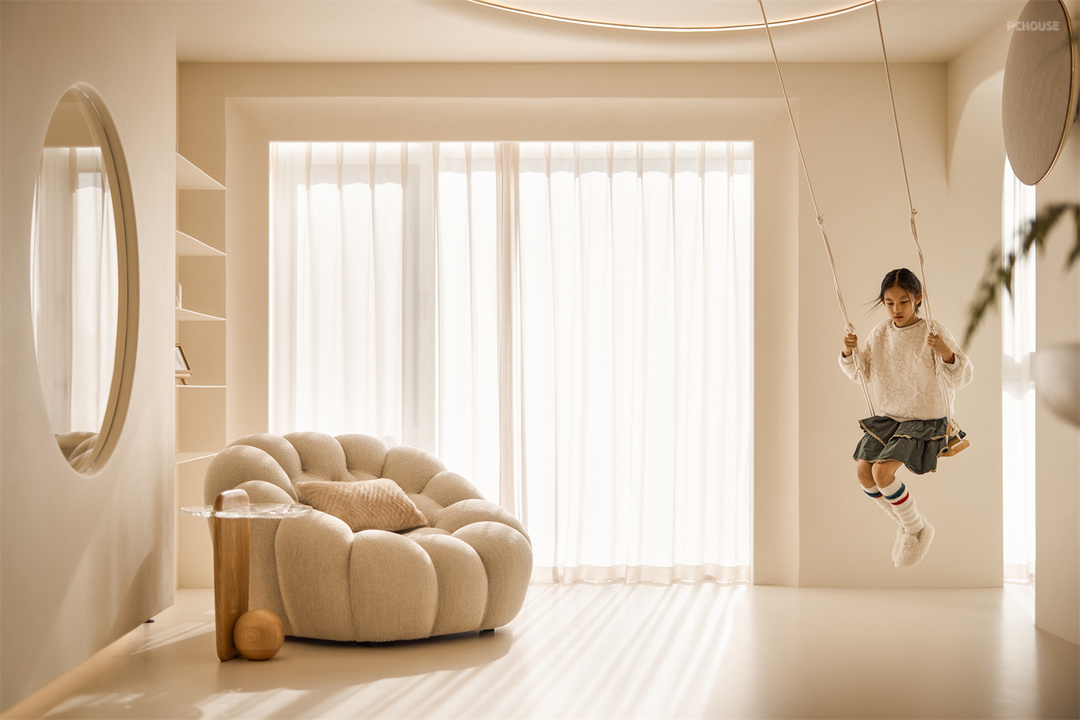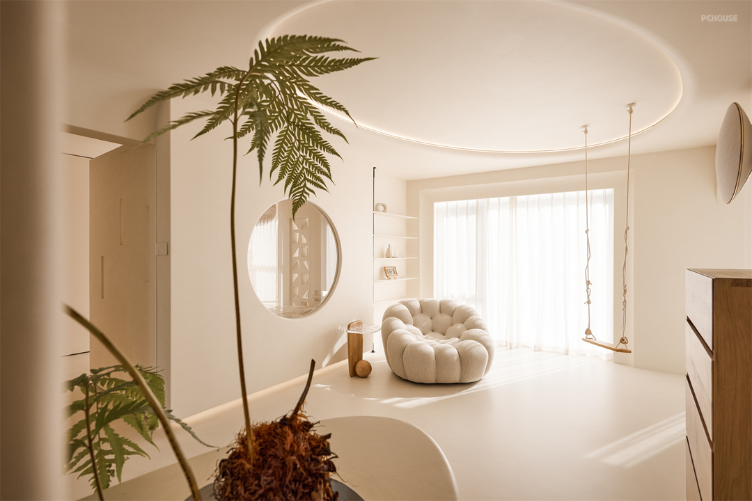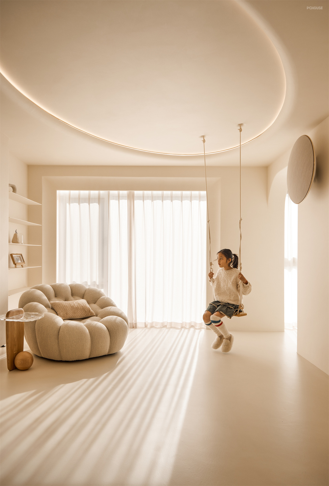 客厅选择打造圆形局部吊顶,圆润收边与其弧形线条相呼应,为纯白静谧的空间增添几分柔和与婉约,一座秋千定制于此,打破了客厅原有的功能尺度,赋予家以活泼的趣味性,也是妈妈对女儿精心浪漫的爱意。