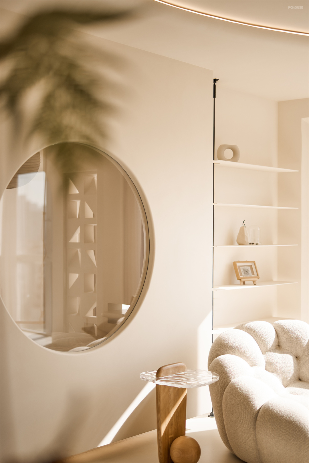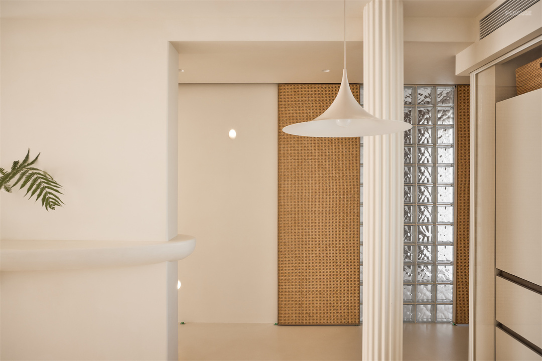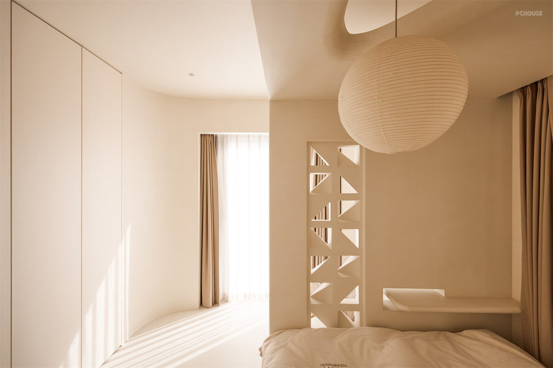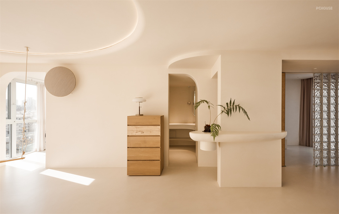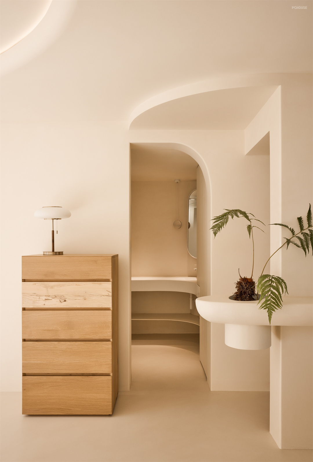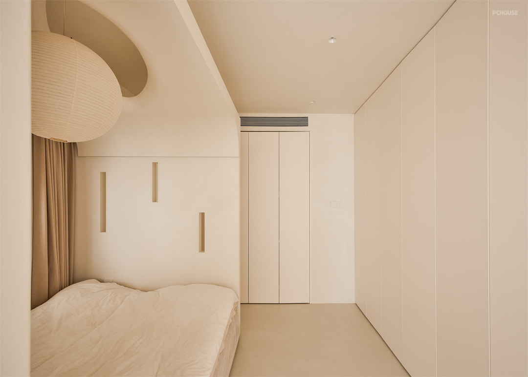 空间整体以白为底色,墙、顶、地一体化设计,选择米色系微水泥,从平面与纵向等多个维度上强调空间视觉上的整体感,以形成一个完整的包裹感,给予居住其间的家人更充分的安全感与放松治愈力。