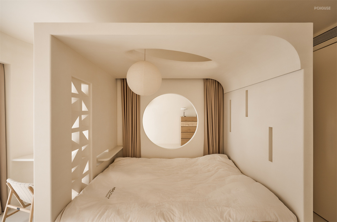 主卧原本墙体也进行拆除改造,依托于床体定制一个全方位包裹的“盒子体块”,来实现一个安全感与私密性兼顾的睡眠空间。与客厅间的隔墙上开凿圆形窗洞并嵌入玻璃,大大拉近两个空间的距离,增添互动感,让家人的相处时光与模式更加灵活且温情。