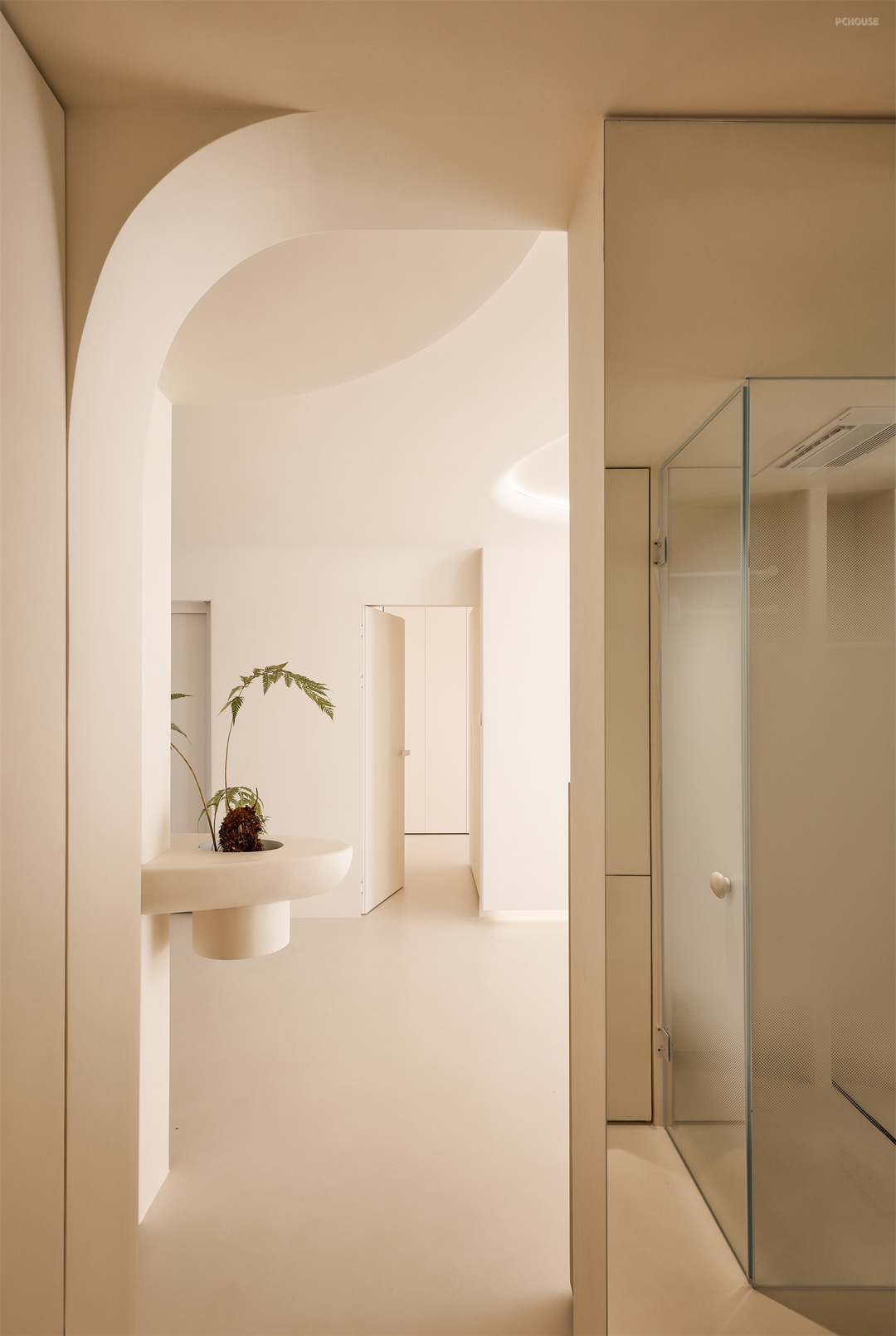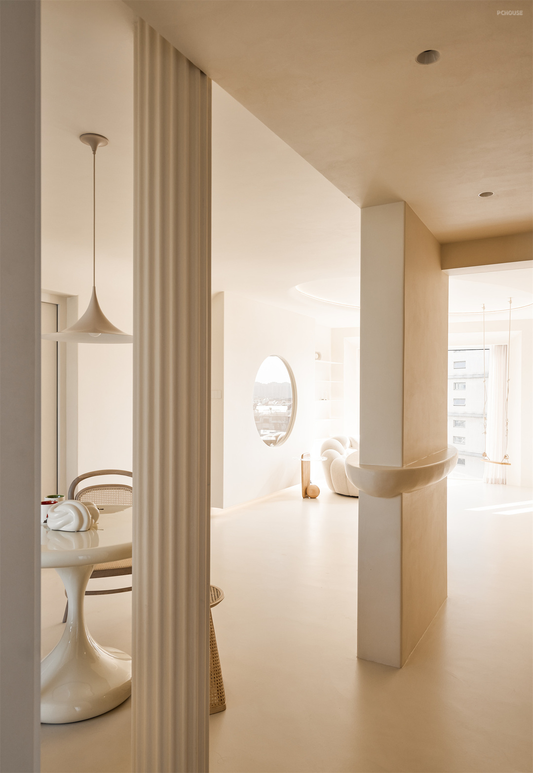 从洗手间看向客餐厅公区,门洞做单边拱形处理,与干区弧形洗手池形成呼应,也契合整体气质,为纯白空间增添柔和之感。