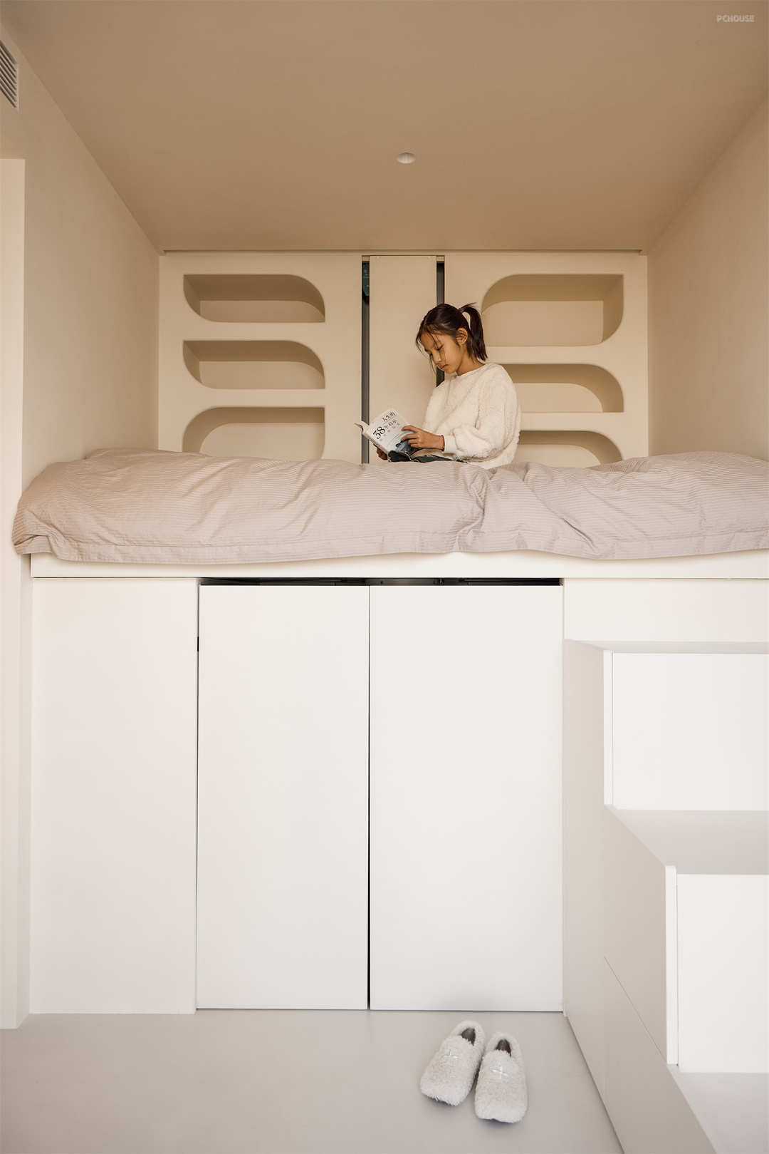 女儿房做上床下收纳结构,充分利用空间,丰富储物容量及孩子的活动空间。定制可移动床垫,轻松控制床体上下挪移,让空间具有多重可能性,也更显趣味别致,符合孩子的喜好。侧面墙上于轨道两侧打造不规则壁龛,方便置物或者藏书,取代床头柜功能。