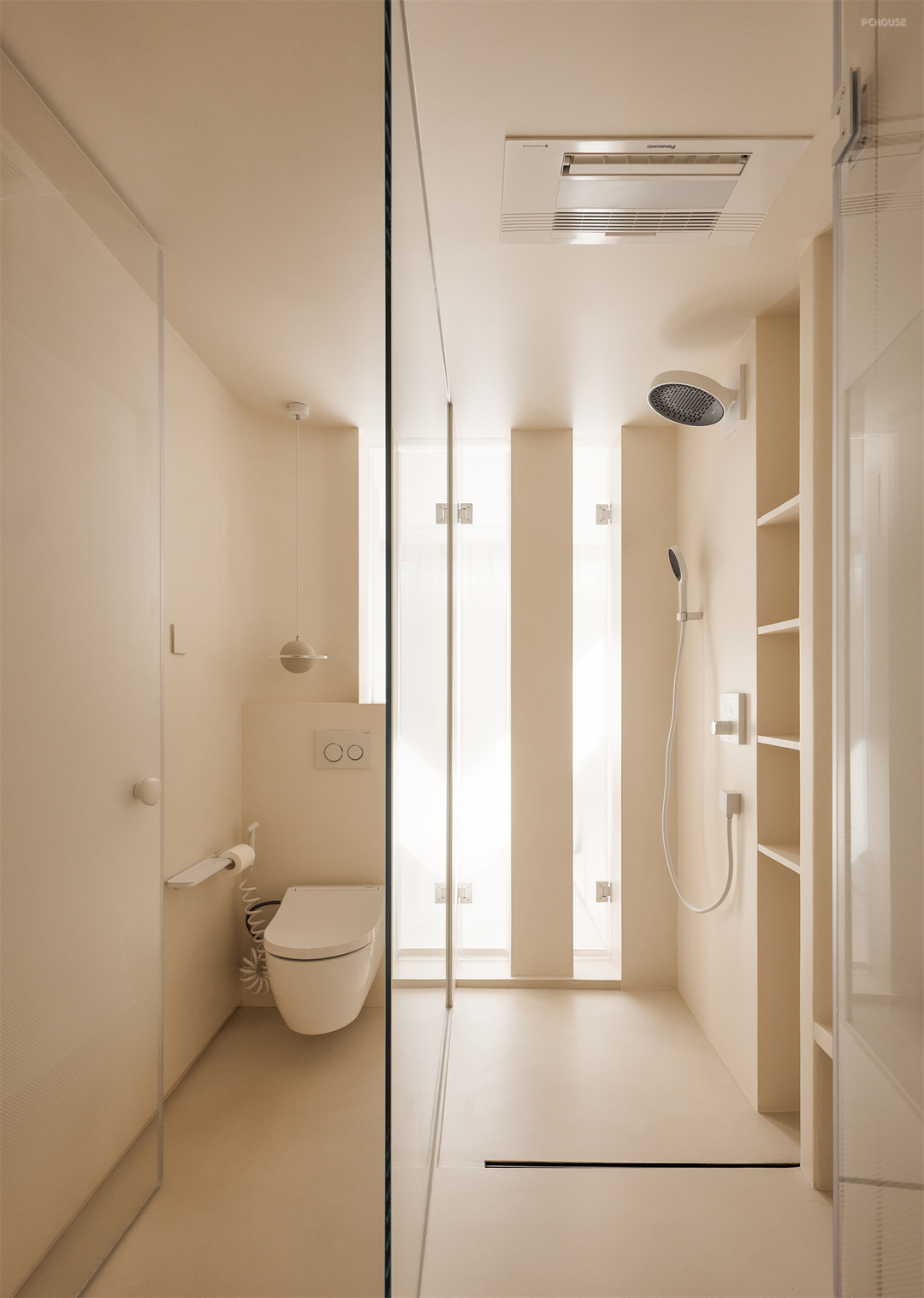 马桶区与淋浴间分别做独立布局,日常使用时各功能区域互不干扰,更为方便。两方区域均采用玻璃隔断以及玻璃门,以最大限度保证采光入室,打造一个通风透气明朗舒适的洗浴空间。淋浴间侧面做壁龛处理,多层高开放格设计满足不同置物需求,方便且实用。