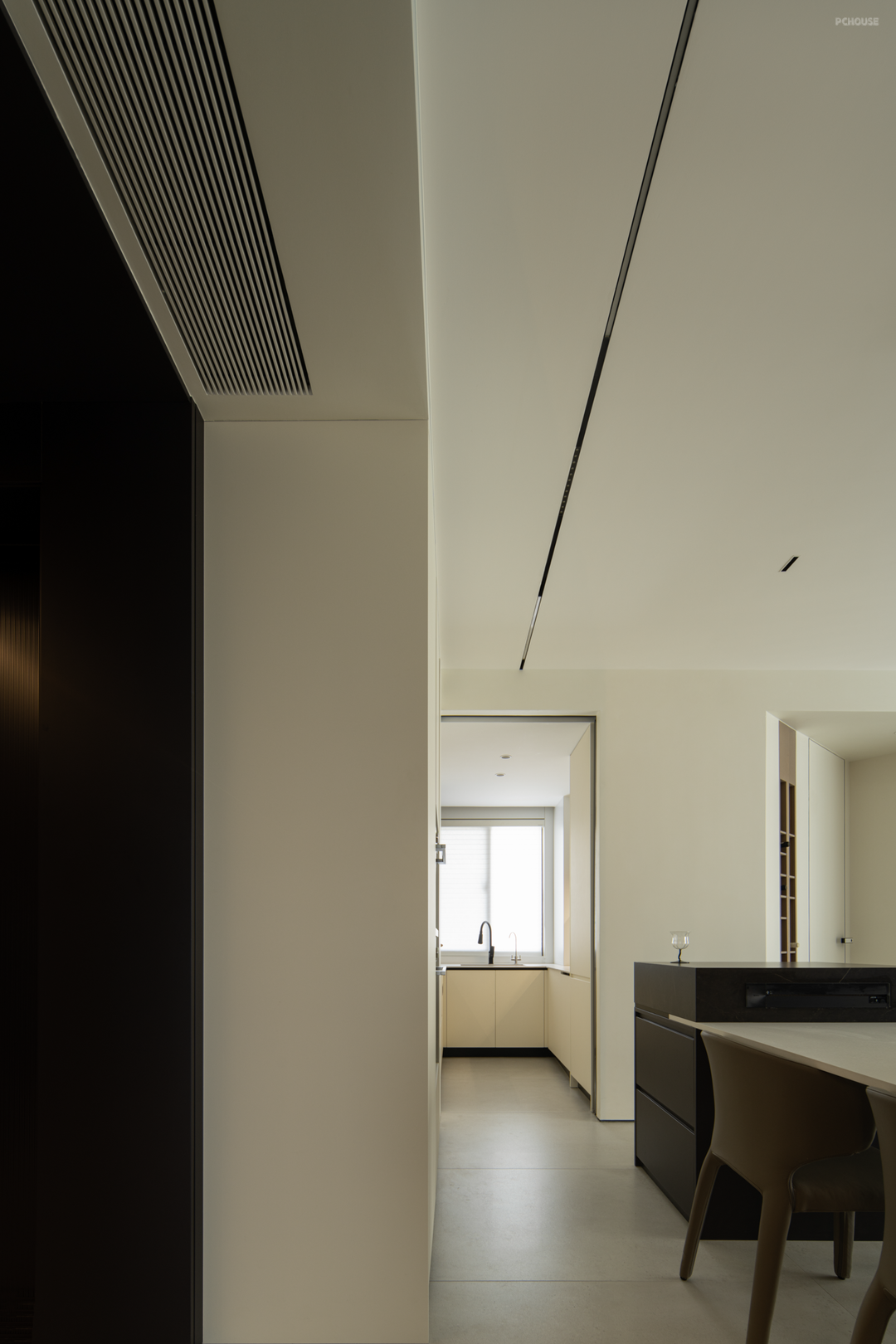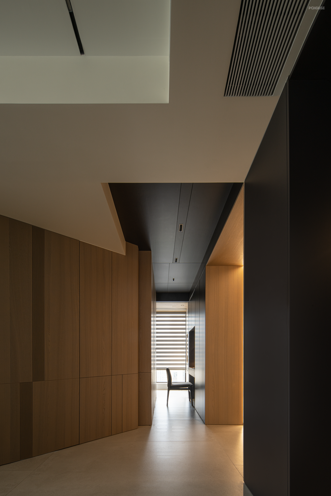 黑色木饰面作为主卧的背景,成为空间中的重色,赋予其沉淀感,同时布置线性暖色光源穿插其间,平衡突然的色彩变化带来的视觉陌生性,赋予纯净空间柔和温暖的感知力。