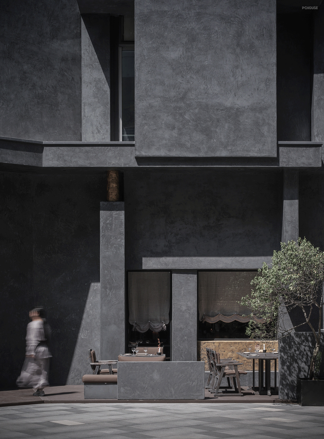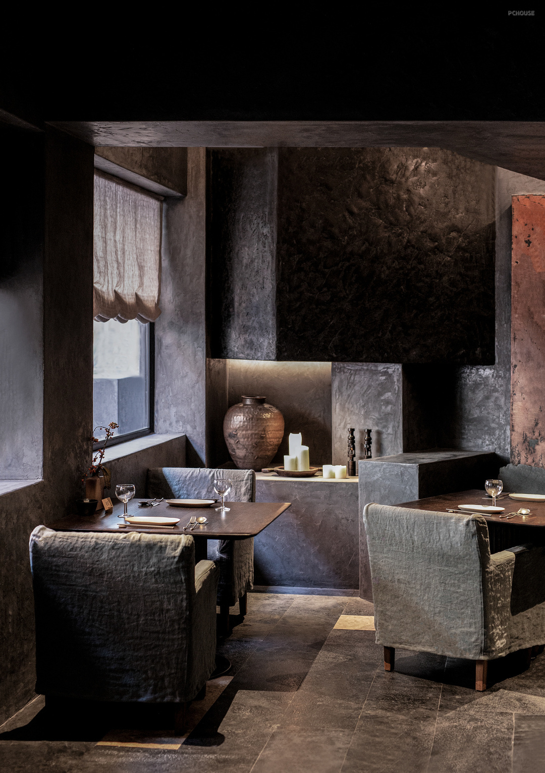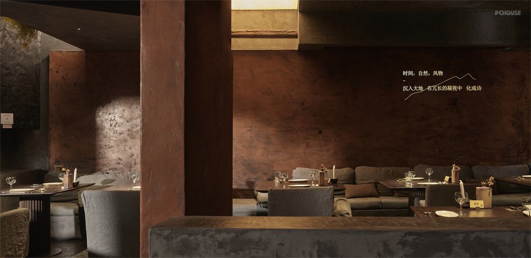 将诗性的图像语言排列组合,直观地映射于空间的立面中,这些跳跃的、非线性的设计脉络经由大地质感的场景转述,最终通过视觉的捕捉映射于观者的内心。