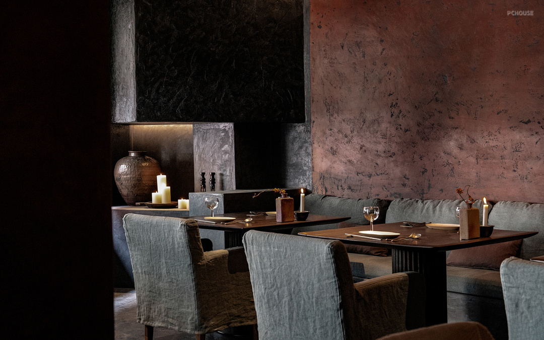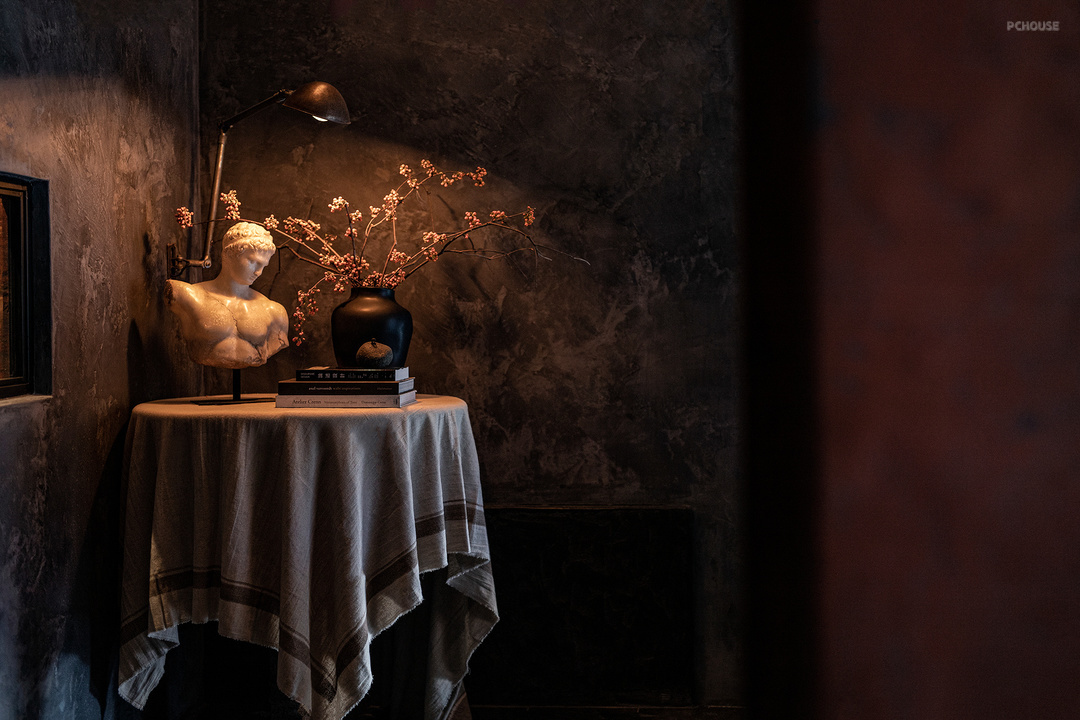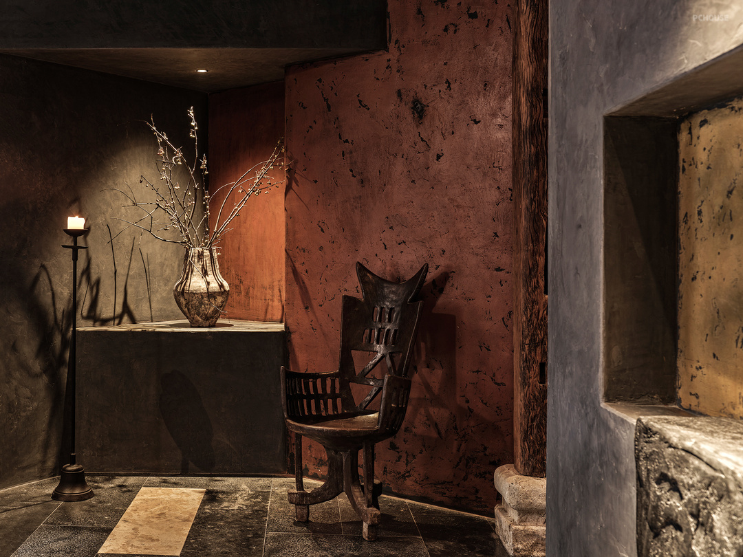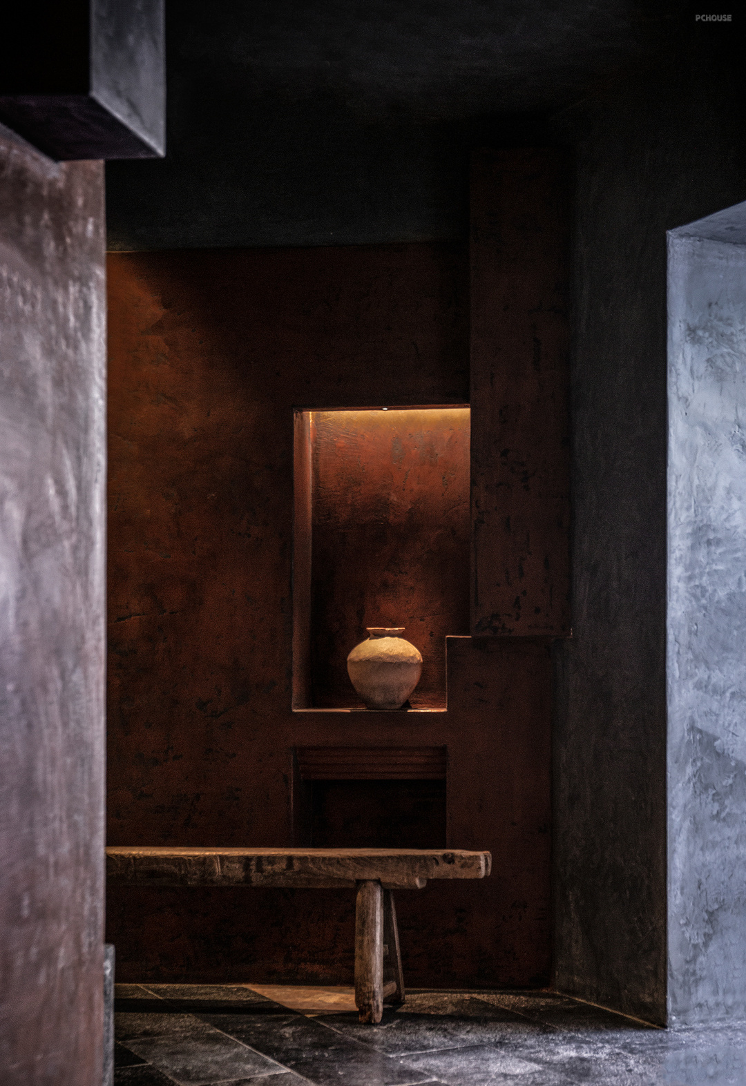在空间的工艺探索中,我们直面扎根于大地之中朴质且原始的自然力量,携手荒雀水泥艺术家,独家打造“灰金X大地漆红”色系漆面,并糅合金箔工艺与几何构造,使空间呈现油画般的质感与肌理。