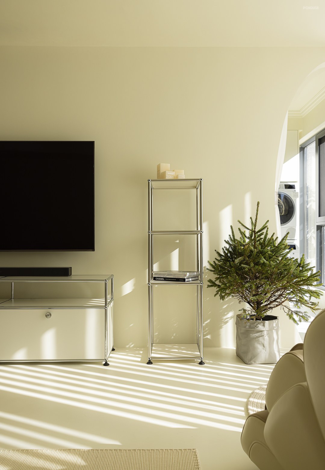 原阳台隔断拆除后剩下的墙体刚好是一组收纳柜的深度,延伸至落地窗前