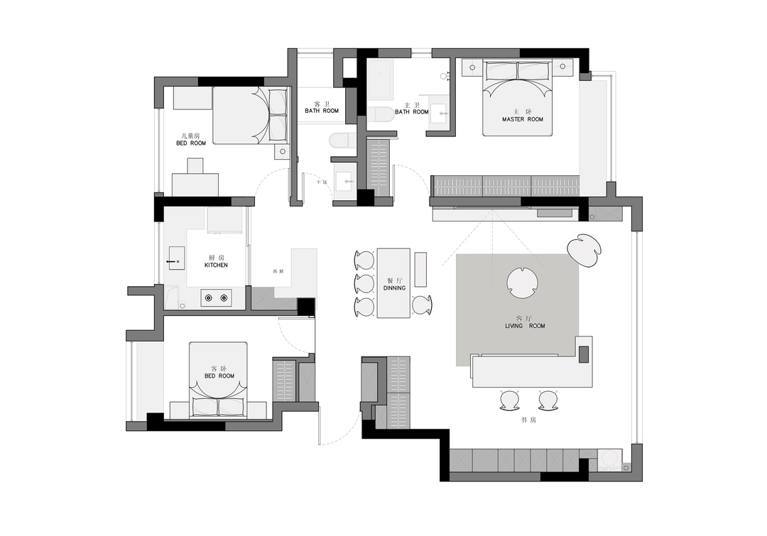 自由平面代表着对传统空间界限的打破和重新定义。传统的墙壁和隔断被削弱或者消除,取而代之的是开放式的、流动的平面设计。这种设计理念使得空间变得更加通透和开放,让不同区域之间的界限模糊化,营造出更加宽敞和连贯的居住环境。流动空间则强调家居空间的多功能性和变化性。这种设计理念使得家居空间可以根据用户的需求和活动来进行自由组合和重新布置,从而满足不同居住场景下的需求。