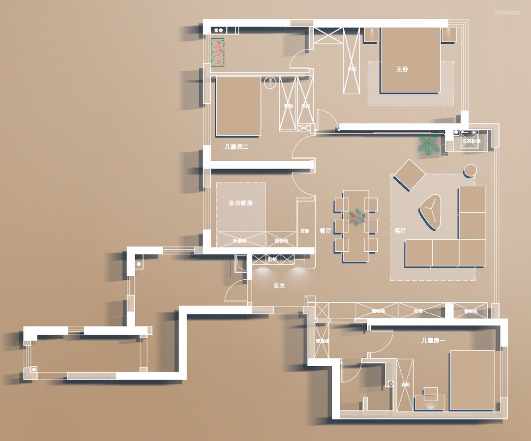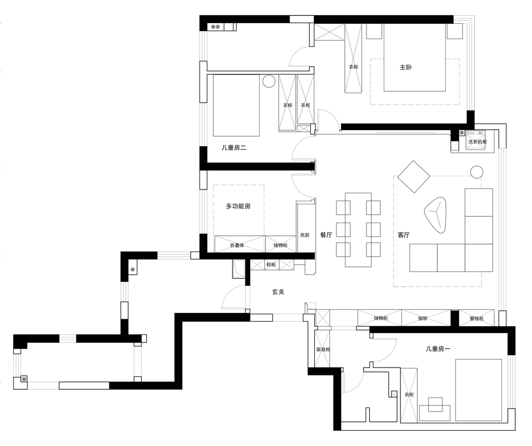 阳台拆掉和客餐厅融为一体,采用异形沙发保证客餐厅尺寸正常使用的同时儿童娱乐区也相应变大