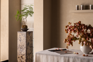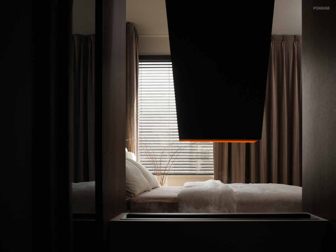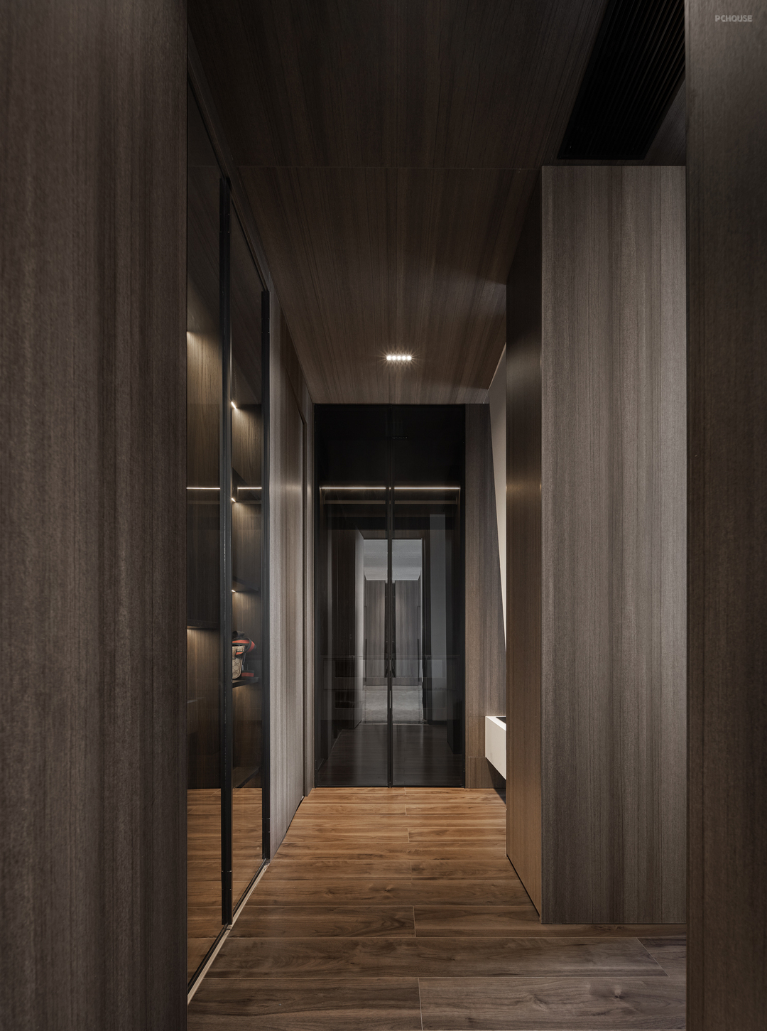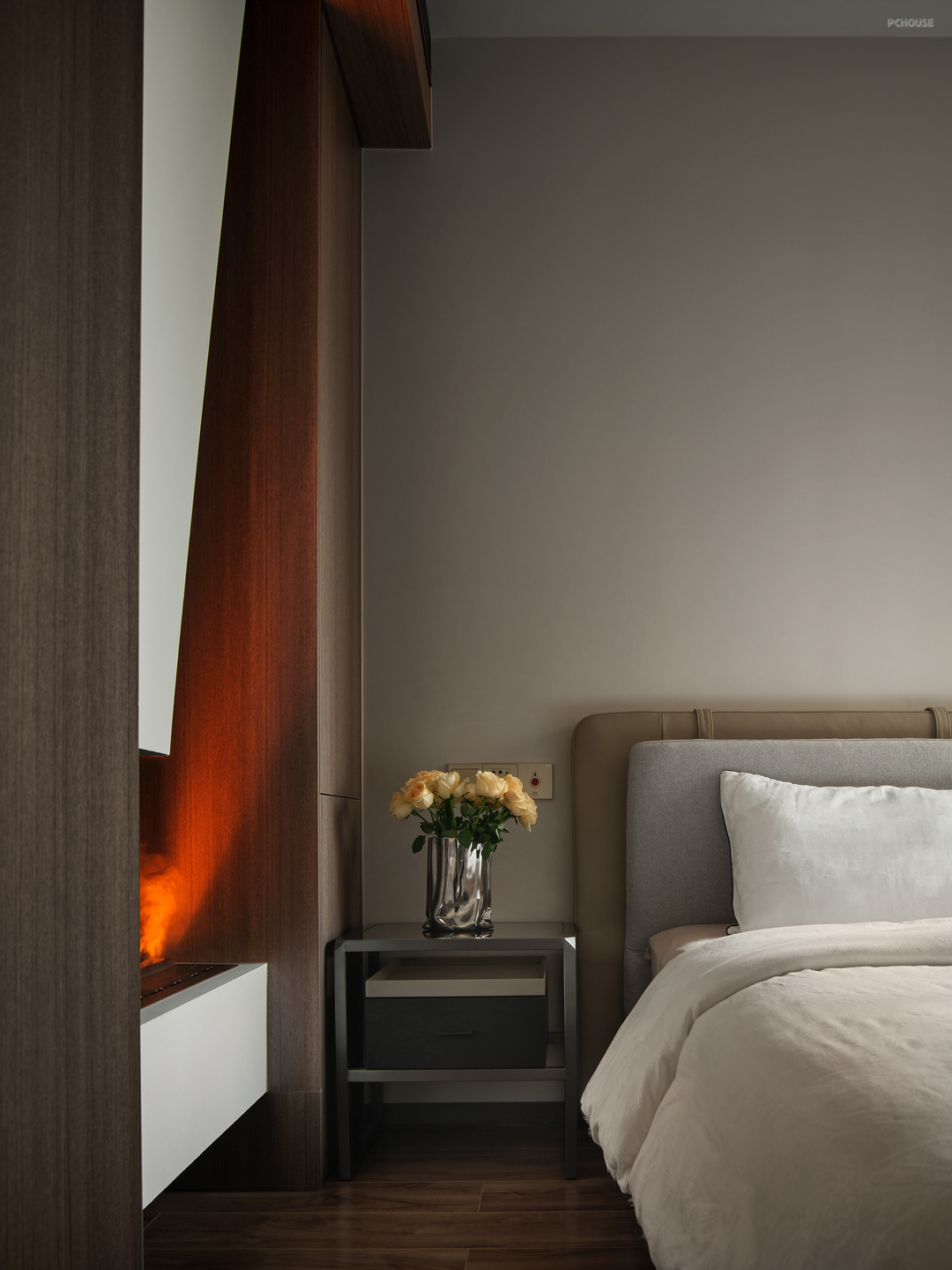 主卫门正对主卧床头,将其设计成了隐形门和壁炉衣柜的样式,保证了通透度的同时,还提供了充足的储物空间。