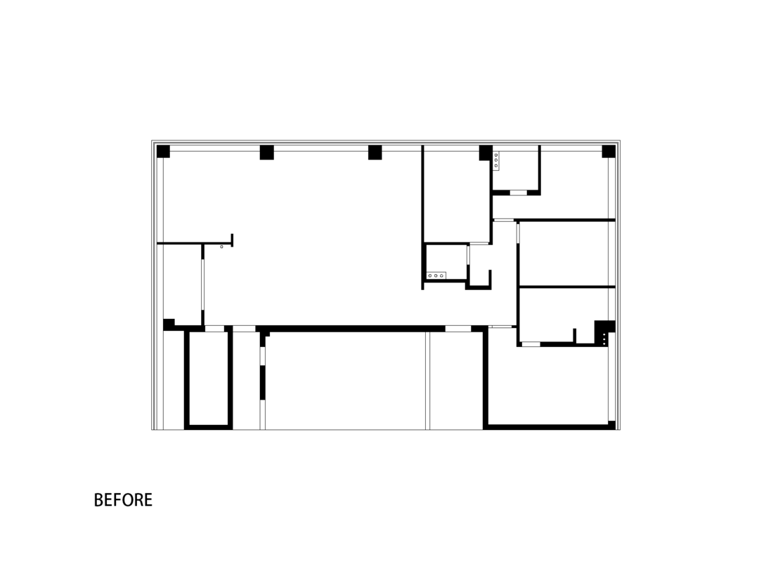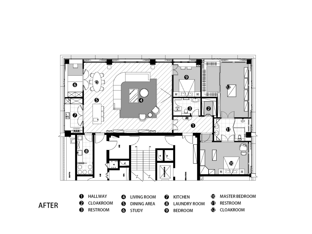 设计师以屋主的生活方式为出发点,对房屋进行了大刀阔斧的空间改造。客厅的原始横梁不可拆除,设计师巧用故宫建筑构思,井格的吊顶设计,达到延展开阔的动感视觉效果。原始房屋以幕墙玻璃为主,同时拥有50cm宽的窗台不可拆卸。为处理此处结构的弊端,设计师在窗台处巧妙地新增经典的法式窗,兼具艺术与实用性。打通两间卧室做独立步入式衣帽间,极大地丰富储存空间,满足女主人的收纳需求。卫生间以三分离+双台盆设计,大大提高使用效率与舒适性。