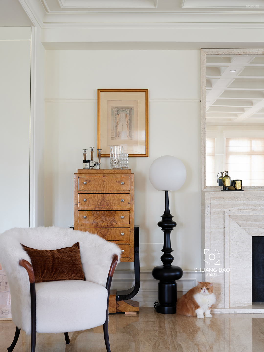 Art Deco高脚柜独具装饰艺术风格,由黑色乌木U形底座与鸟眼枫木组成,兼具艺术与收纳实用性,与上方的vintage挂画一齐静默无声地诉说着悠远岁月的痕迹。绵软丰盈的Giorgetti扶手椅,铁木扶手造型别致,其灵感来自古董手杖,柔软细腻的羊绒触感顺滑,让人在坐下的那一刻不由自主放下防备。猫咪居于室内自由活动,蕴含历史韵味的中古家具与一系列现代家居相融共生,我们设计师聚焦材质、色彩与空间舒适度,突出多元融合与舒适随性的生活方式