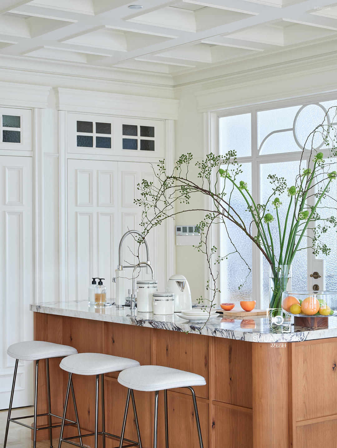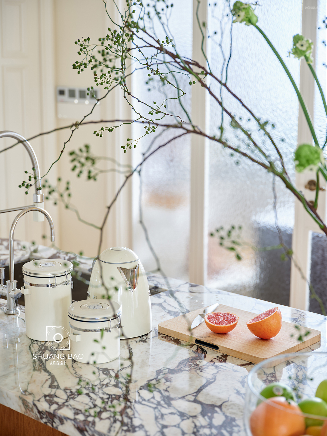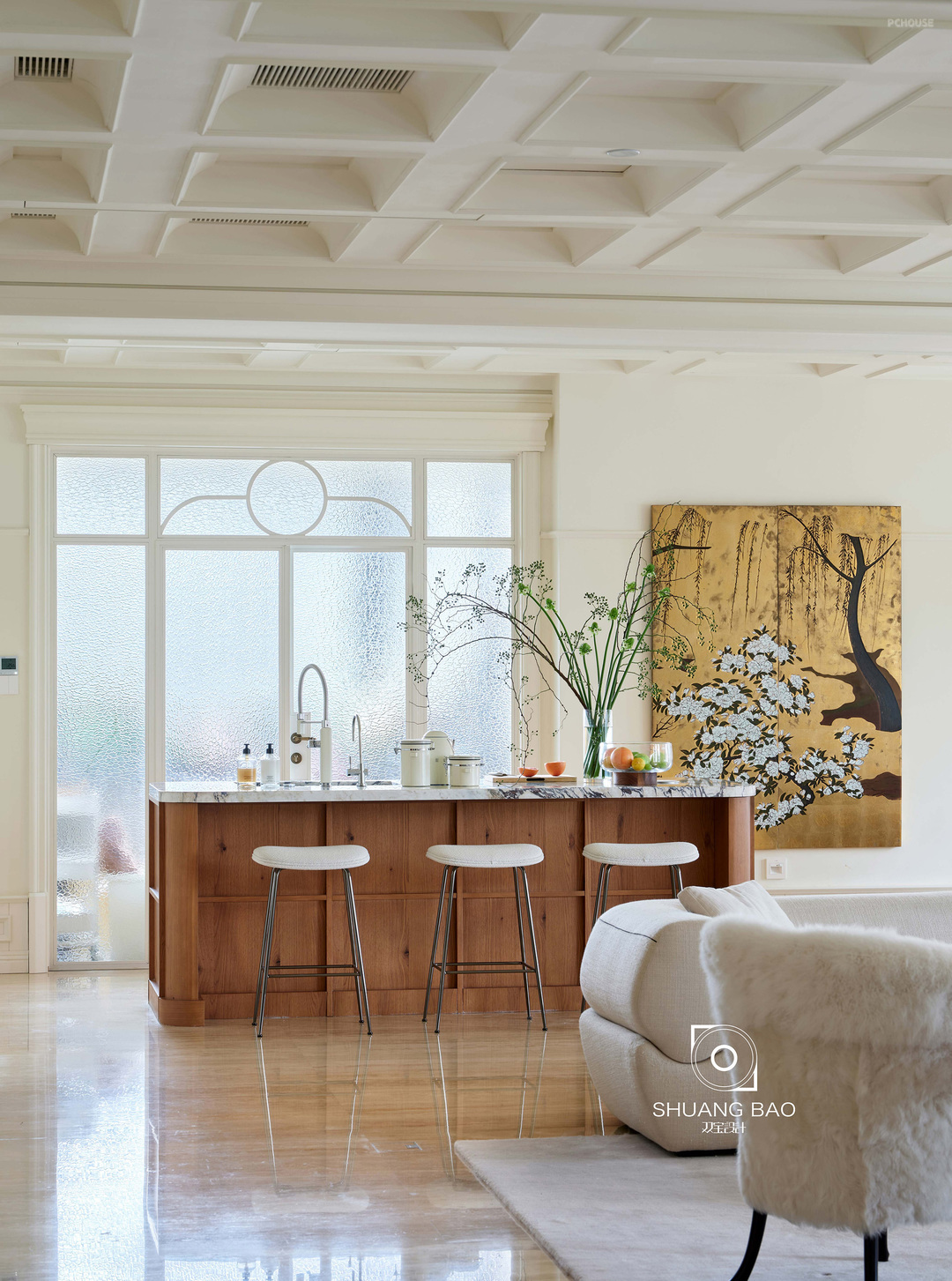 法式压花玻璃门友好地隔绝中厨区域的油烟味,水波纹理透出隐隐约约的朦胧,以自身材质为室内引入自然光线。公共区域选用天然洞石通铺地面,足以抵御日常宠物的磨损,也方便日常清理,维护健康和整洁的居住环境。墙上的樱梅柳图画呈现出静态和谐的空静景致,自然之韵与生活之诗于家中交织错落