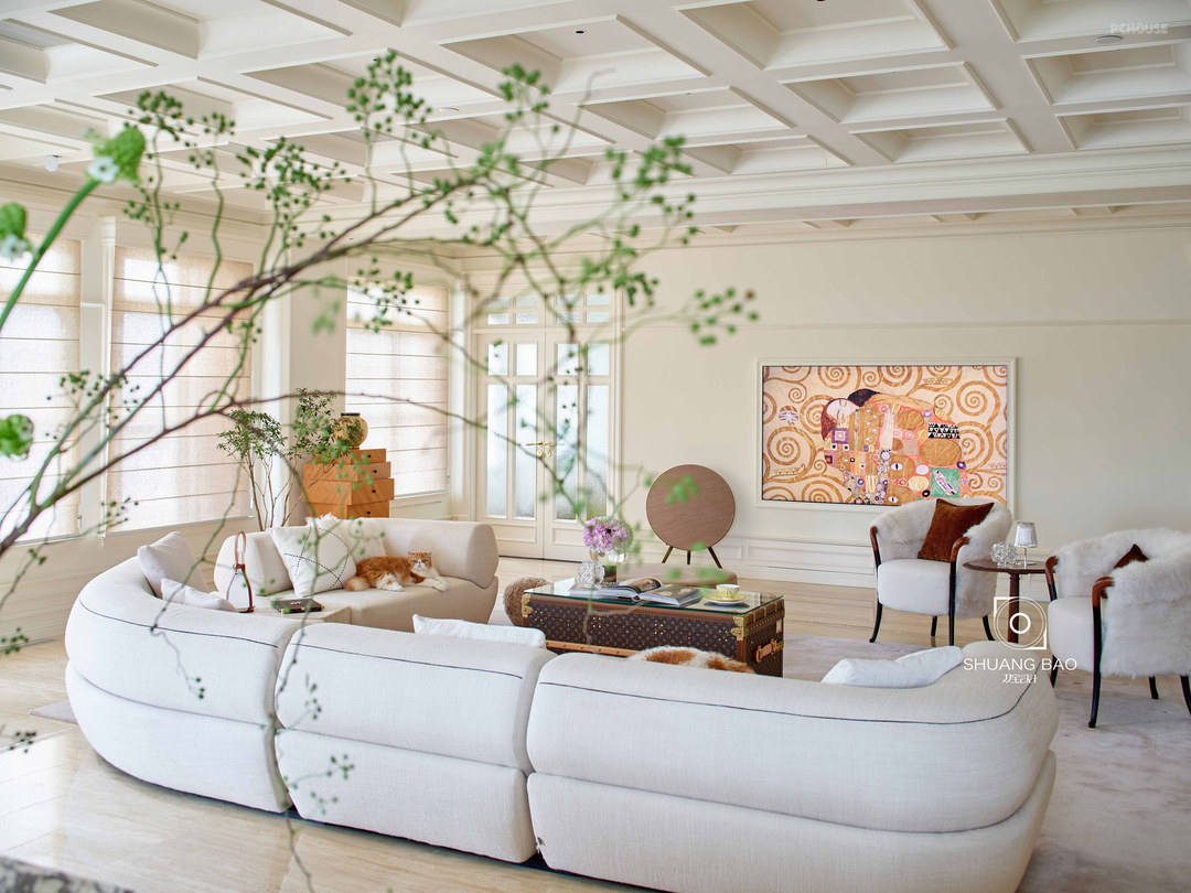 推开居所大门,过厅处摆放着屋主在外淘来的路易十六风格的樱木五斗柜,为迎接主人的回归做好收纳准备。古铜金把手与金纹镶边,彰显屋主复古雅致的艺术品味。珍珠白的墙面整洁利落,墙上Vintage挂画稳重气韵,两架温润复古的单椅静置于挂画之下,再次为过厅增添了一丝中古硬朗的艺术气息。在此处设计师以四扇法式双开门的巧妙布局,周密防止宠物进入屋主私人空间造成混乱或出逃户外的隐患