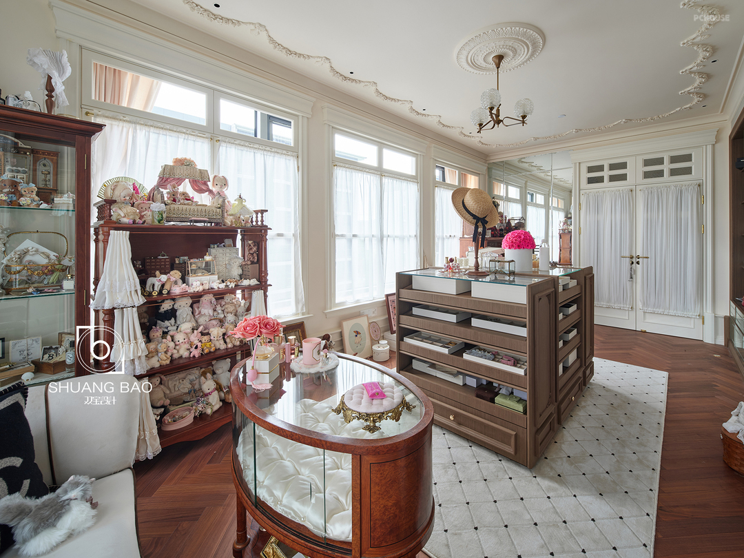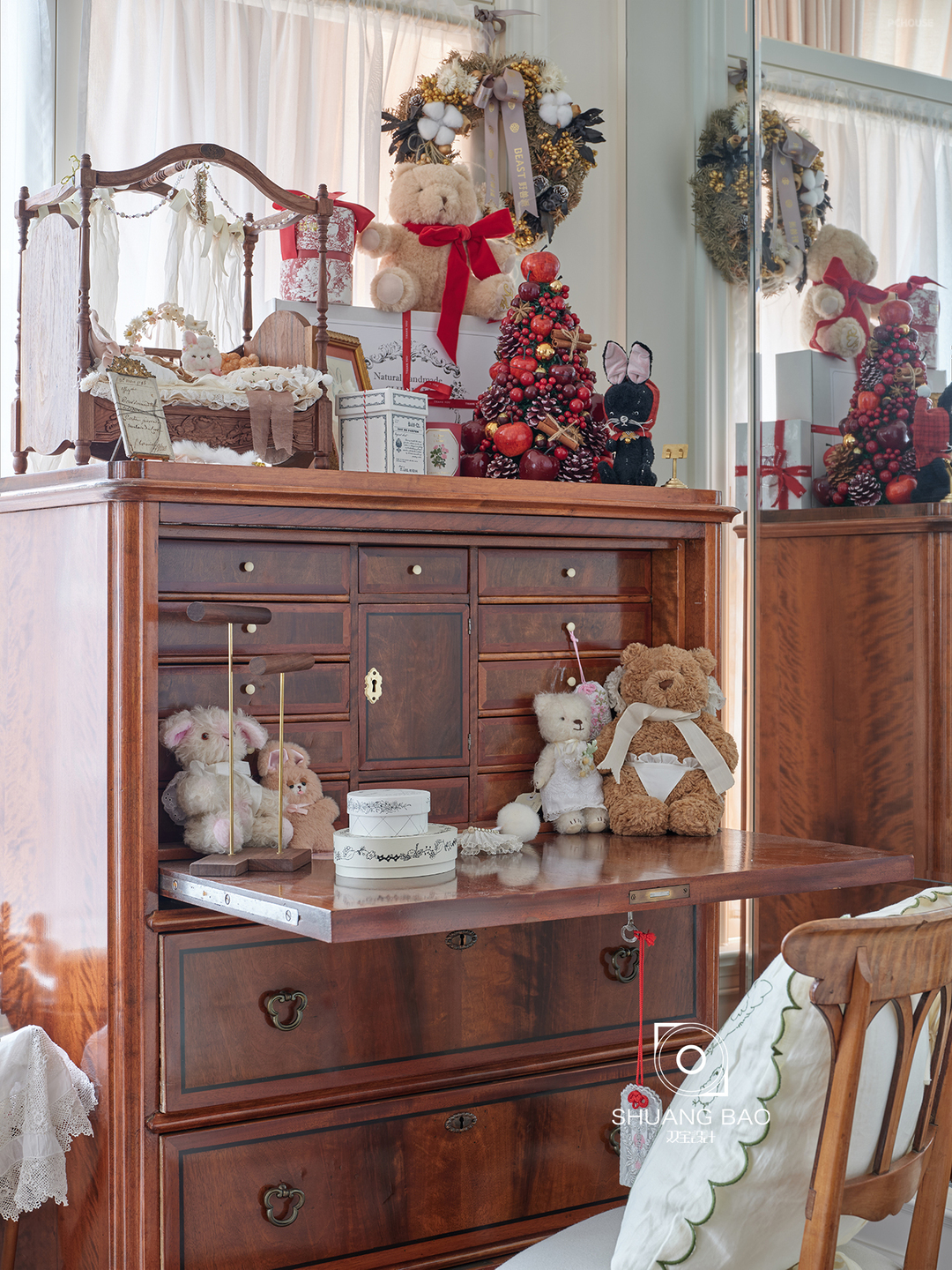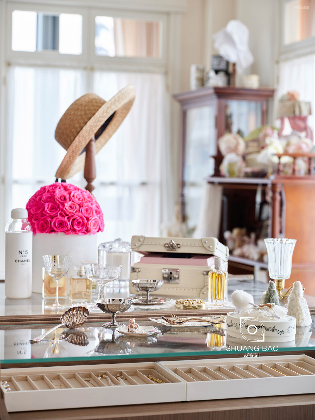 Vintage边柜桃花心木纹理清晰,色泽温润,木质结合玻璃的设计,复古配色保留法式的经典特色,处处考究的细节延续至整个空间。室内姿态各异的玩偶都是女主人的宝贝,华美闪耀而不浮夸。环视整个衣帽间,它承载着非常多的女主人的情感,室内的每一件物什都是丰富而立体的存在